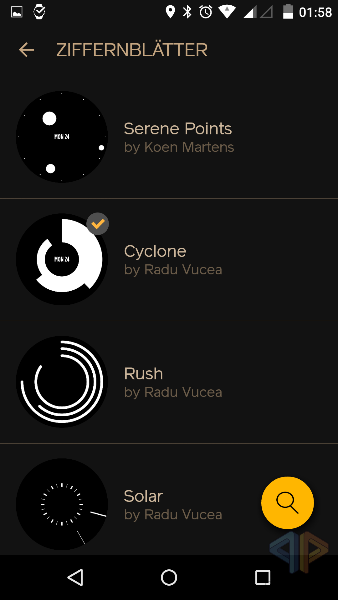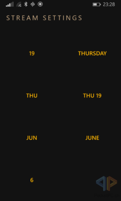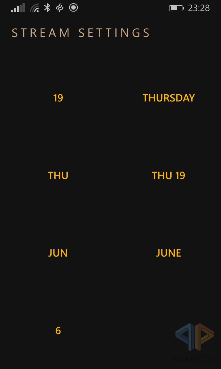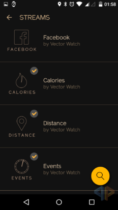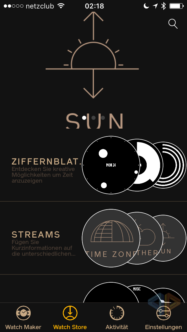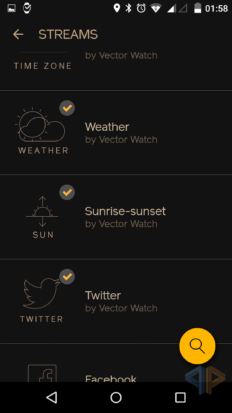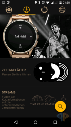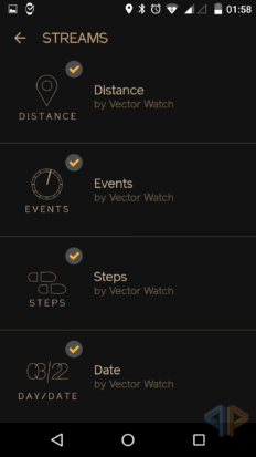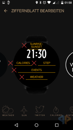 Dabei haben alle Ziffernblätter die Möglichkeit so genannte Steams, die Informationen aus Diensten wie Twitter und Facebook anzeigen, Aktienverläufe, Wetterdaten, Schritte, Kalorien, Schlafdauer oder zurückgelegte Distanzen, kommende Termine und Erinnerungen, Sonnenauf- und Untergang und mehr einzubinden. Diese Steams kann man, je nach Watchface, an verschiedenen Positionen unterbringen und auch entsprechend individuell einrichten. Für den Twitter-Steam beispielsweise kann neben den aktuellen Followern des Accounts auch die Likes und Re-Tweets des letzten eigenen Tweets ausgewählt werden oder die Trend-Themen anzeigen.