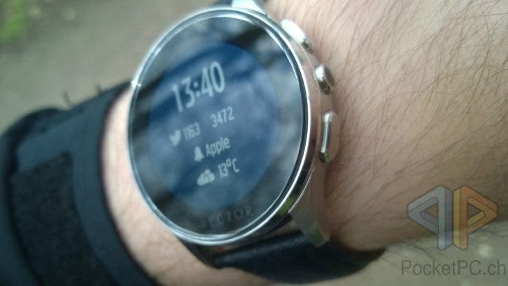 Mit am wichtigsten bei einem derartigen Gerät ist die Anzeige. Das Display der Vector Watch Luna ist mit seiner 240 x 240 Pixel auflösenden Flüssigkristallanzeige gut zu lesen und bietet, dank monochromer Darstellung, einen hervorragenden Kontrast an. Auch unter direktem Sonnenlicht spiegelt das sehr robuste Mineralglas vergleichsweise wenig und die Smartwatch kann gut abgelesen werden. Die Hintergrundbeleuchtung wird automatisch an die Umgebungslichtverhältnisse angepasst und ist ausreichend hell. Das Schlafzimmer kann man damit nicht beleuchten, wie manch anderes Mitbewerber-Produkt es doch bisweilen schaffen, aber die Anzeige kann sowohl im Dunklen als auch am helllichten Tag gut abgelesen werden. Das Display-Glas, was vom Hersteller leider nicht näher spezifiziert wird, erweist sich als äusserst robust und kratzest. Ein versehentliches Schrammen der Wand oder Steintischkante macht dem Glas überhaupt nichts, eher sind minimale Dellen oder Kratzer im Edelstahlgehäuse nach erheblicher Krafteinwirkung zu finden, als im Uhrenglas – beeindruckend.