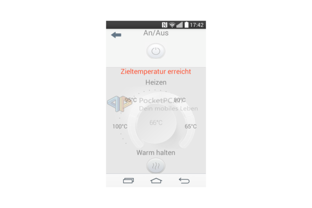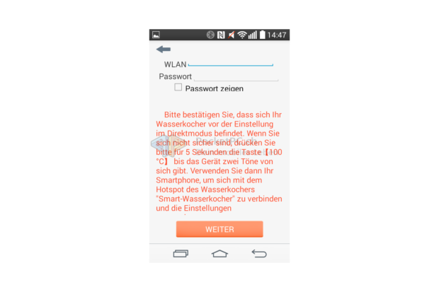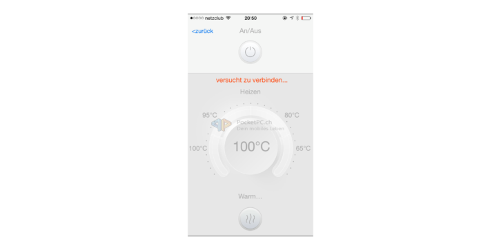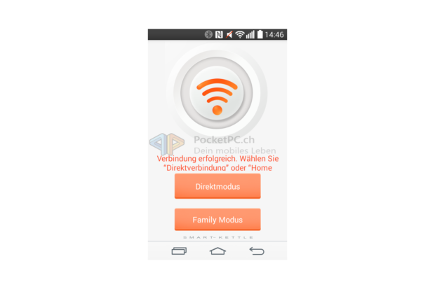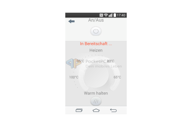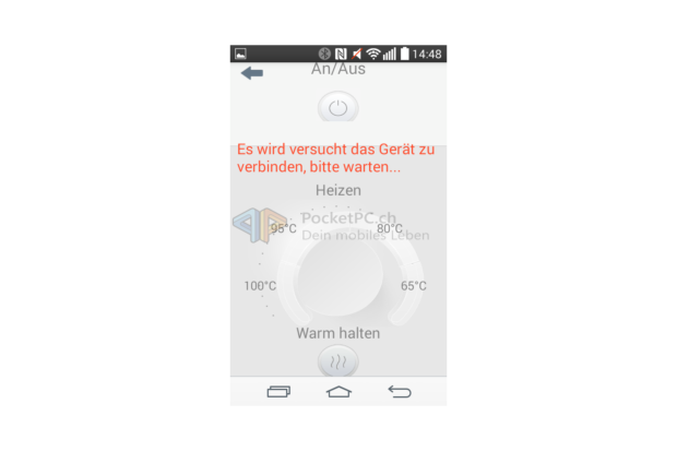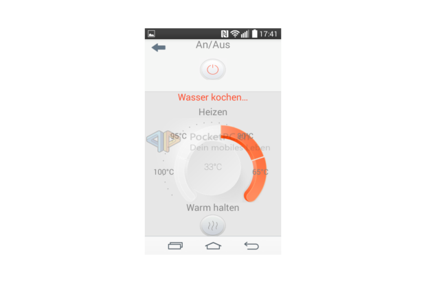 Dabei ist die Bedienung sehr einfach. Der WLAN-Wasserkocher kennt zwei Betriebsmodi: Direkt- und Familymodus. Bei Ersterem dient der Wasserkocher als Access Point und bietet ein unverschlüsseltes WLAN-Signal namens SmartKettle an, natürlich ohne Internetzugang. Letzterer Modus bedeutet, dass der Wasserkocher im privaten WLAN als Client eingebunden wird und so das iOS– oder Android-Gerät dieses auch benutzen kann. Eingerichtet wird dieser Modus, indem man zu erst eine direkte Verbindung aufbaut und die Zugangsdaten zum privaten WLAN übermittelt. In beiden Modi lässt sich der Wasserkocher ganz simpel steuern. Ein/Aus startet den Kochvorgang oder beendet diesen. Auf einer kreisförmigen Skala lassen sich die gewünschte Zieltemperatur bzw. die Warmhaltefunktion wählen, in der Mitte wird die aktuell gemessene Temperatur angezeigt. Wenn die Zieltemperatur erreicht wird, zeigt die App dies mit einer entsprechenden Meldung an. Über mehr Funktionen verfügen die Apps nicht. Sie sind auf beiden Betriebssystemen halbwegs passabel ins Deutsche übersetzt worden, skalieren aber gerade auf Android nicht auf allen Geräten sauber – schade. Auch schade ist, dass sie keinen Gebrauch von den Benachrichtigungs- bzw. Mitteilungszentralen der mobilen OS machen.