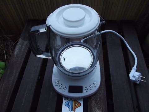 Das Wasser wird mit bis zu 1200 Watt bei der Glaskanne, 1850 Watt beim Edelstahlbehälter erhitzt und entsprechend schnell sprudelt es. Dabei kann an der Basisstation die Temperatur ausgewählt werden: 65 °C für empfindlichen Weissen Tee, 80 °C für erfrischenden grünen Tee, 95 °C für besten Filterkaffee ohne Bitterstoffe und heisskochende 100 °C. Dafür sind vier Tasten auf der Vorderseite zu finden. Zudem kommt eine Taste zum Ein- und Ausschalten sowie eine Warmhalte-Taste, womit der Wasserkocher die aktuelle Temperatur bis zu einer halben Stunde lang hält. Mittig ist ein beleuchtetes LC-Display zu finden, was die aktuell gemessene Temperatur sowie die gewählte Zieltemperatur anzeigt. Wird die Temperatur erreicht, ertönt ein deutlich hörbares, kurzes Piep-Piep. Im Standby verbraucht der Wasserkocher knapp 1 Watt.