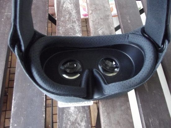 Das Gummiband wird, wie erwähnt, wie bei Skibrillen etwa durch zwei Ösen an der Brille rechts und links geschlauft und dann mittels Mikro-Klettverschluss an sich selbst befestigt. Der Einschub für die Smartphones, welche für die Bilder und Töne der virtuellen Welten verantwortlich sind, ist immer offen. Er misst ca. 8 mm und lässt sich problemlos vergrössern. Darin klemmt das Smartphone, gut von Gummipolstern geschützt und festgehalten. Doch auch die Person, die die Xiamoi VR PLAY 2 trägt, wird gepolstert: Ein mikroporöser, verwebter Schaum um die Augenpartie soll sowohl das Licht der Aussenwelt abhalten, als auch für hohen Tragekomfort sorgen. Auf der Oberseite rechts ist zudem ein mechanischer Knopf angebracht, der die Carboard-typische Aktionstaste bildet.
