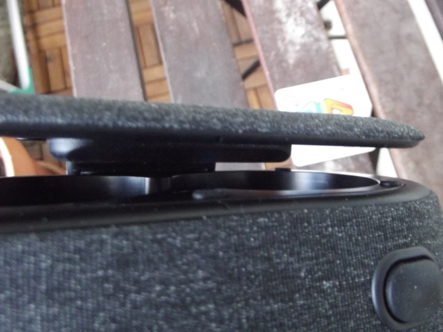 Der Button auf der Oberseite lässt sich sehr gut ertasten, sehen kann man ihn mit aufgesetzter VR-Brille ja nicht, und löst zuverlässig und präzise aus. Dabei wird ein mechanischer Druck per Gummistempel auf die obere Mitte des Displays des eingelegten Smartphones ausgeübt, um die gewünschte Aktion in der VR-App auszulösen. Der Taster bietet ungewohnt viel widerstand, braucht aber keineswegs viel Kraft zum Auslösen. Er ist eben nur kein Mikrotaster wie am Smartphone, der bei der kleinsten Berührung schon auslöst.