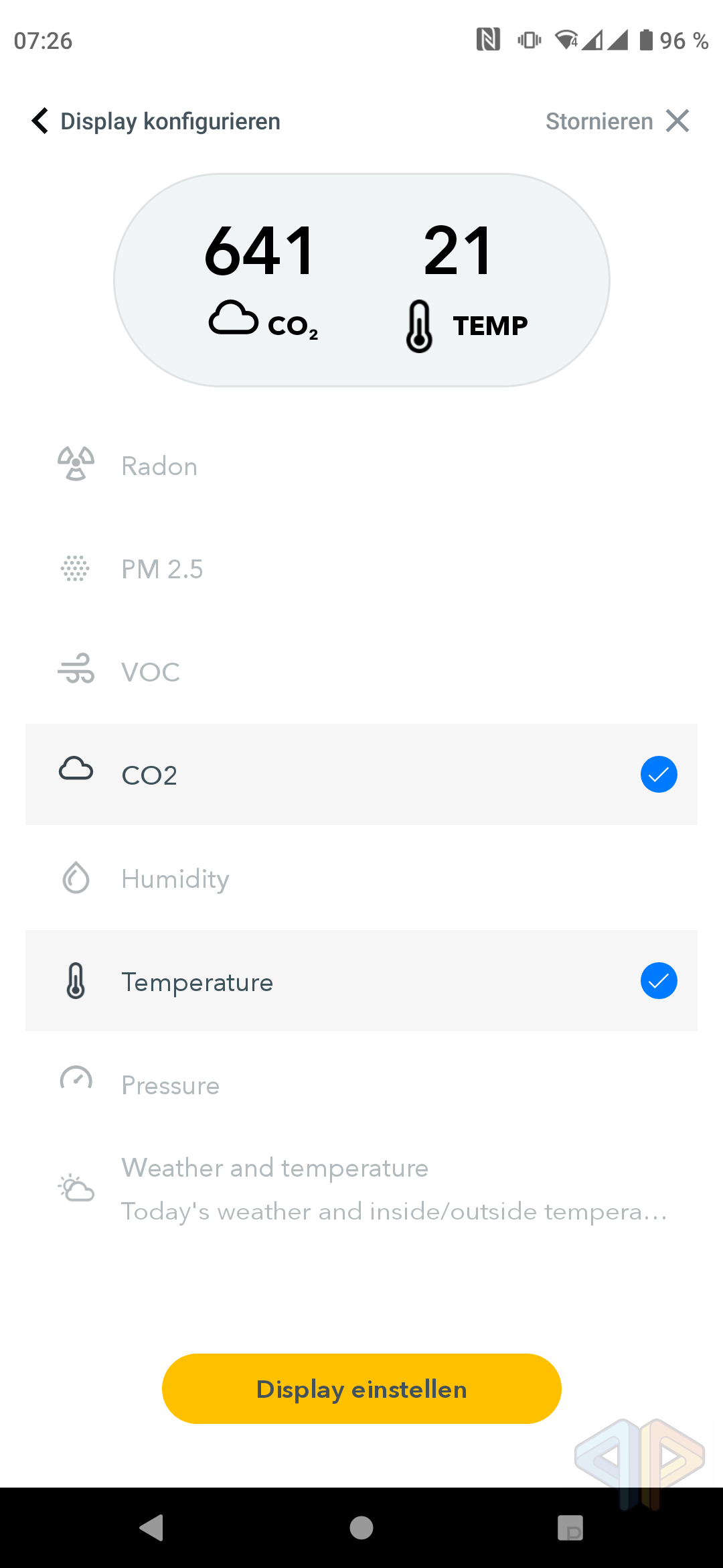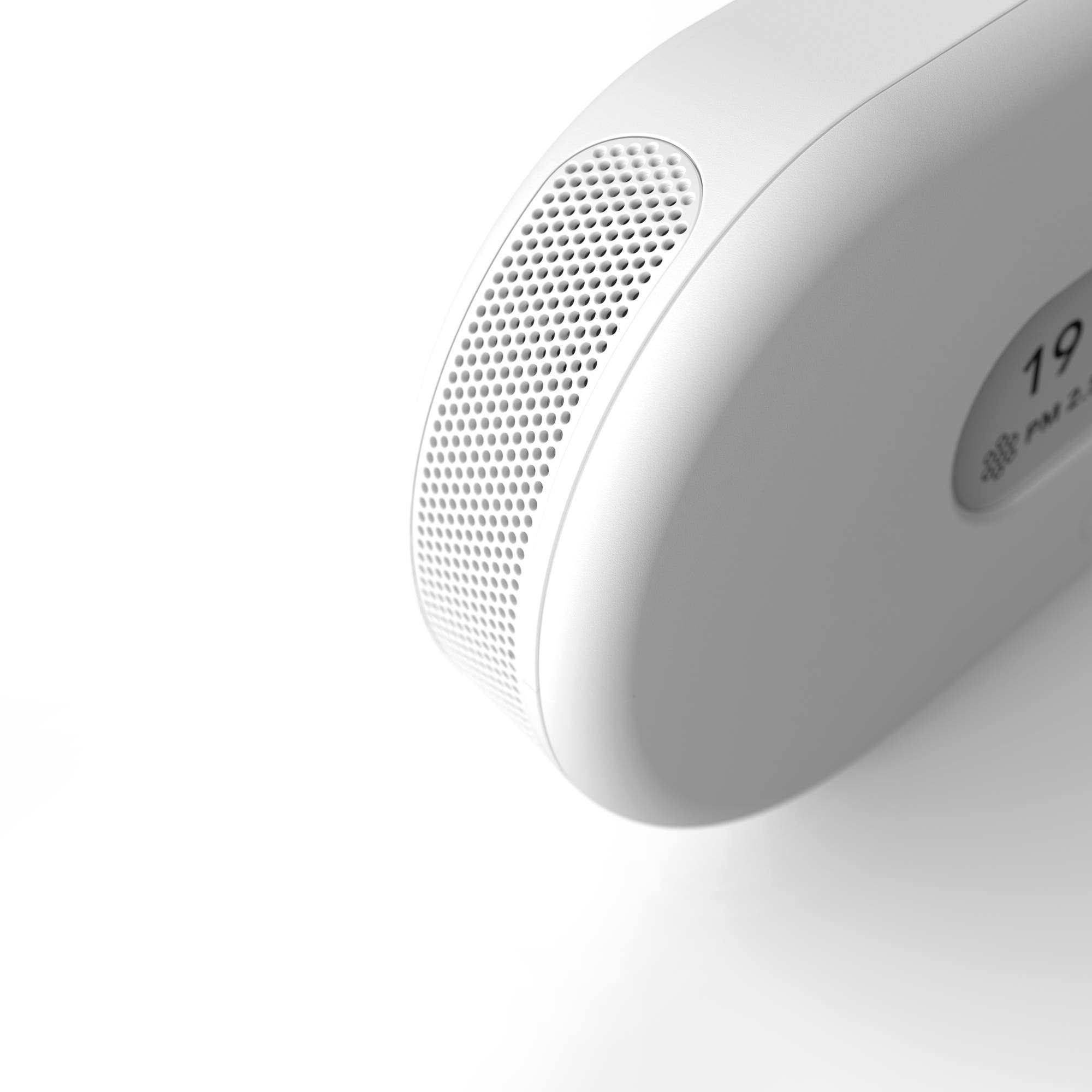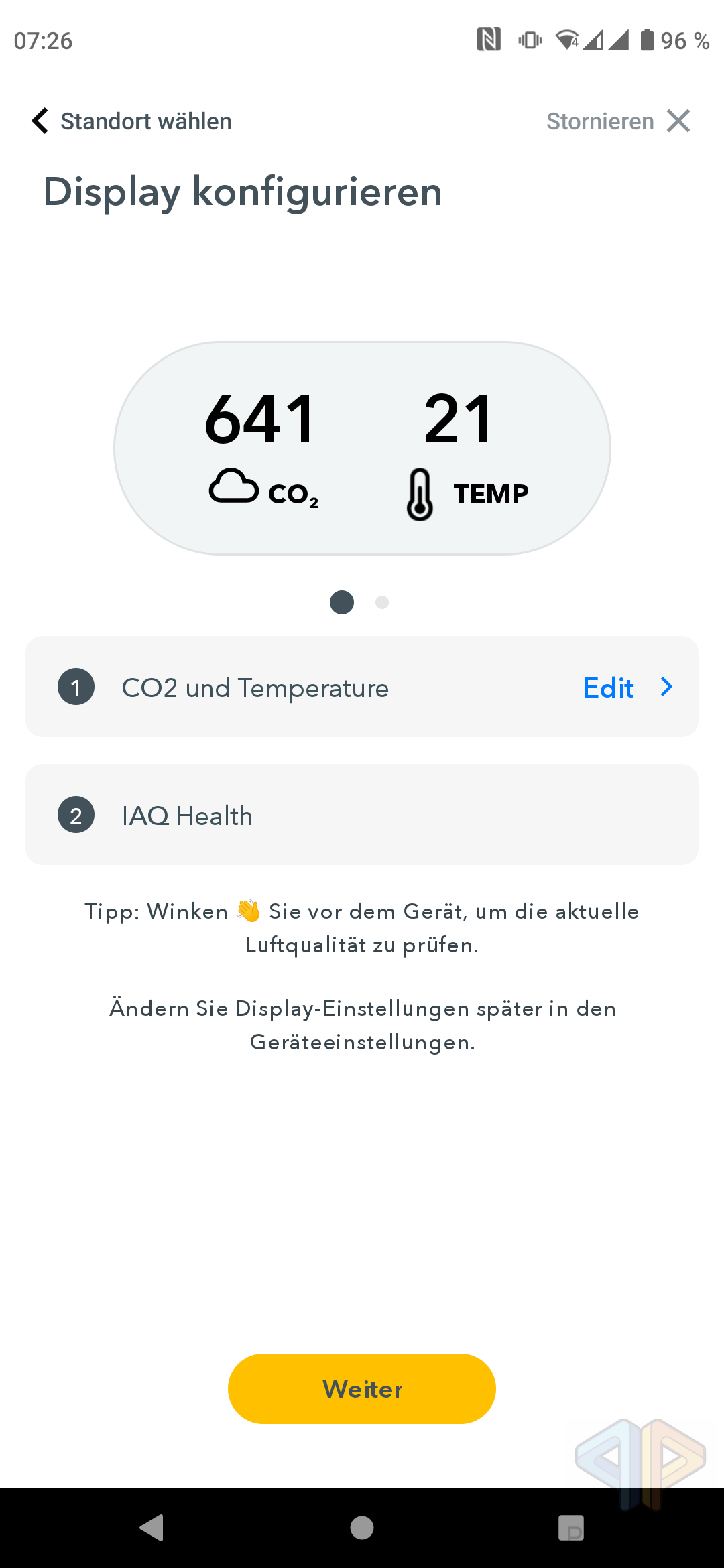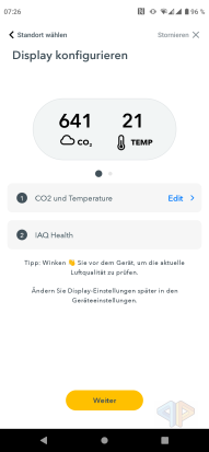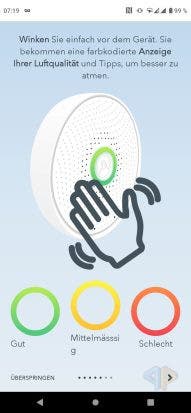 Mit einem Wink der Hand vor dem Display wechselt dieses von der per App einstellbaren Anzeige zweier Messwerte zur Anzeige weiterer vier Sensordatenwerte separat, namentlich auch des IAQ-Health-Indikators, durch die man einfach berührungslos hin- und herwischen kann. Das klappt sehr gut und ist super intuitiv. Auch die LED über dem Display, die als Ampel in Rot, Gelb oder Grün signalisiert, wie der Wert einzuschätzen ist, trägt zu diesem Eindruck bei.