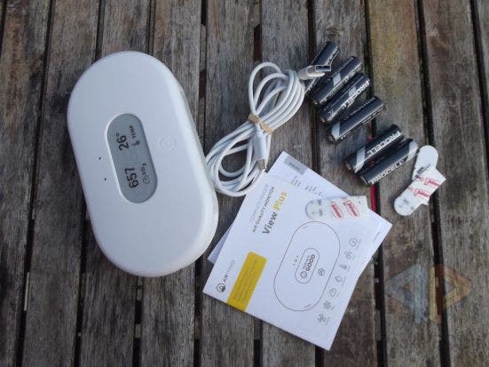 Der neue View Plus von Airthings kommt mit sechs Alkalie-Batterien im AA-Format, einem USB-Typ-C-Ladekabel von 180 cm Länge, einer mehrsprachigen Schnellstartanleitung und regulatorischen Informationen sowie doppeseitigen Klebepads.