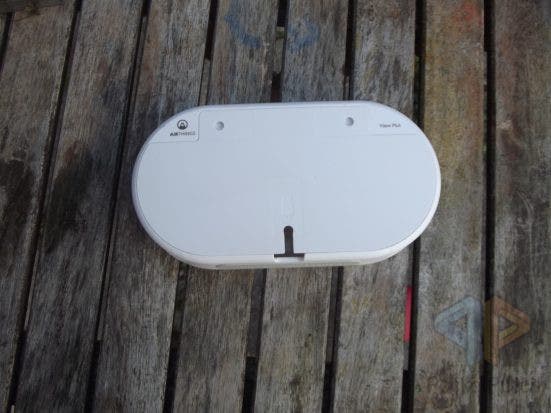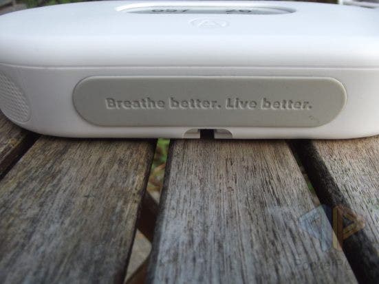 Der Airthings View Plus Luftqualitätsmonitor ist 200 x 115 x 60 mm gross, vornehmlich weiss und mit abgerundeten Seiten versehen. Er wiegt 511 Gramm (ohne Batterien) und hat an beiden Seiten eine feinmaschige Gitterstruktur aufzuweisen. Auf er Unterseite ist ein breiter, hellgrauer Gummistreifen mit der Aufschrift “Breathe better. Live better.” zu sehen. Dieser ist dazu da, den View Plus Luftsensor auch auf glatten Oberflächen rutschsicher aufstellen zu können.