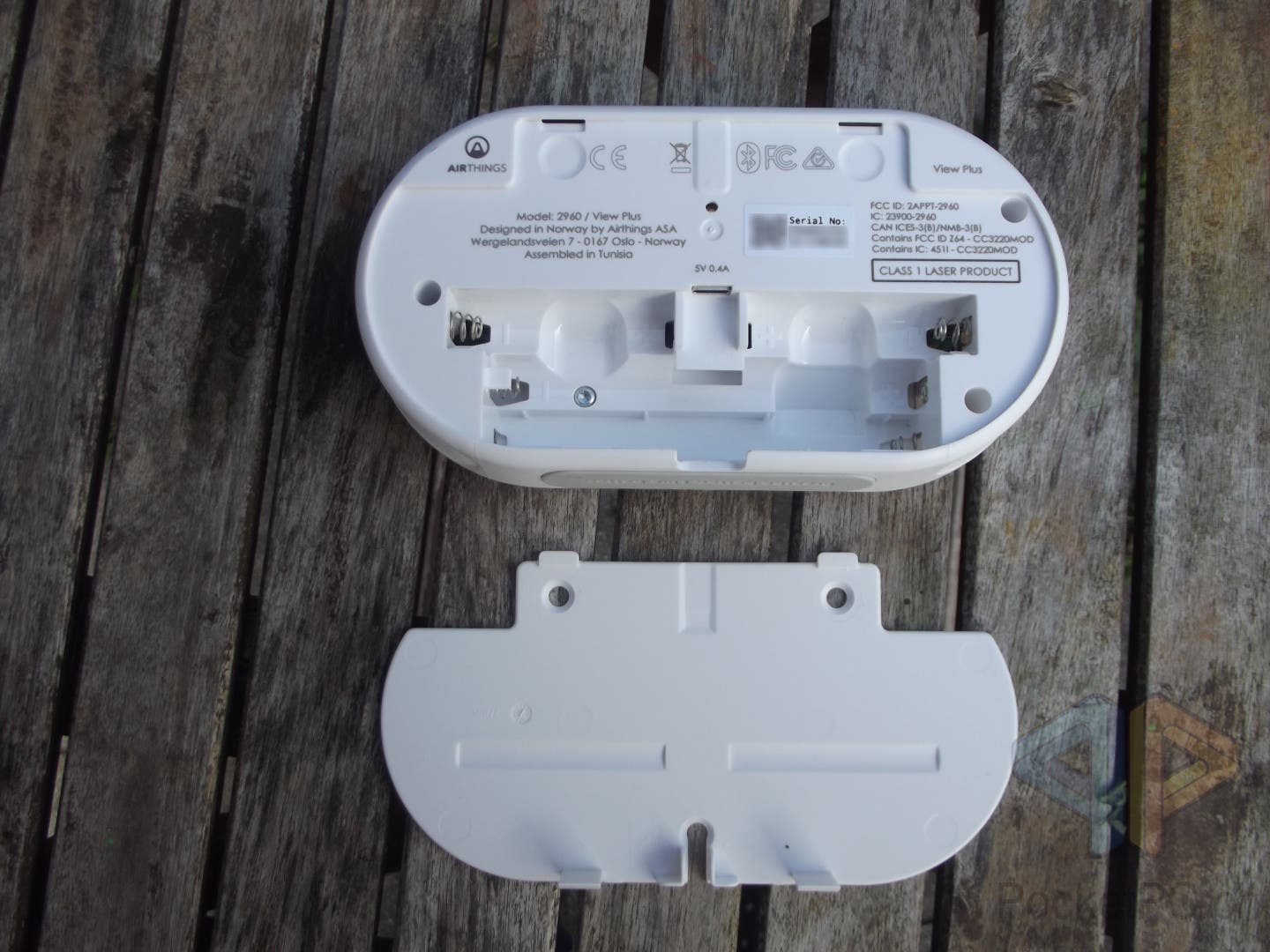 Die Rückseite des norwegischen Luftqualitätssensors birgt eine grosse Abddeckung mit zwei Löchern für die Montage per Schrauben und einer Öffnung unten für das USB-Kabel. Darunter findet sich das Batteriefach, ein Aufkleber mit der Seriennummer und einem kleinen QR-Code zur App-Einrichtung sowie einigne Konfomritätserklärungen und Symbolen. Die sechs Batterien alten laut Hersteller für bis zu zwei Jahre durch.