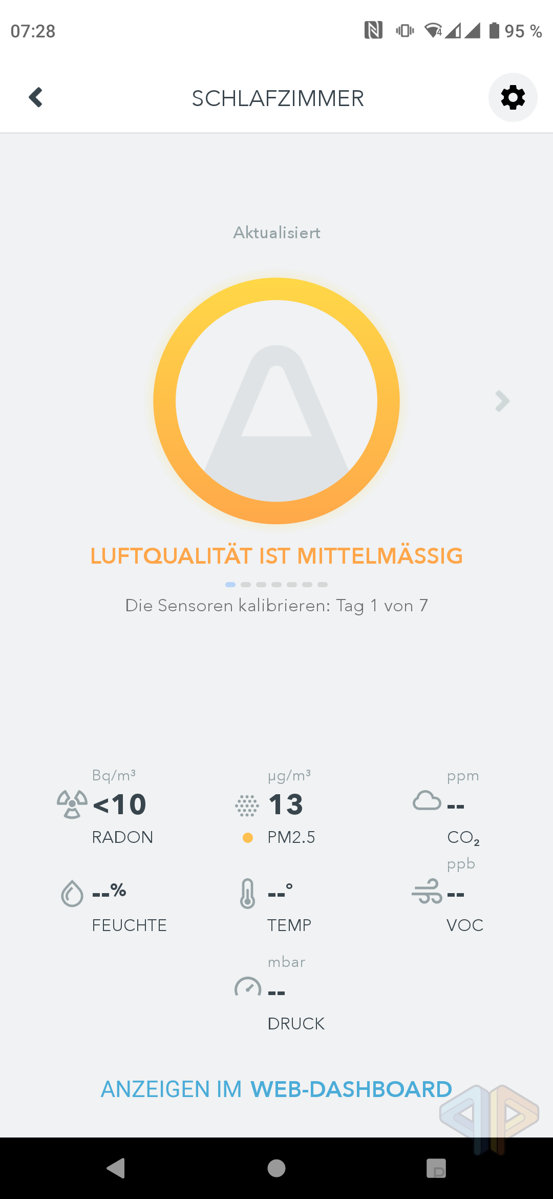 Das Aktualisierungsintervall der Sensordaten in der App, sowohl unter iOS als auch unter Android, und im Online-Dashboard hängt wieder von der Stromversorgung ab: All 10 Minuten oder 60 Minuten bei Batteriebetrieb,