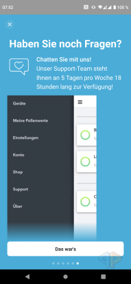 Die App, die auf iOS und Android identisch ist, erlaubt sehr übersichtlich und schnell einen Blick auf die vielen verschiedenen Sensorwerte anzuzeigen, deren Verlauf in hübschen, ampel-bunten Kurven und liefert zudem per Fingerzeig auf das Fragezeichen immer auch mehr Informationen zur Bedeutung des Messwertes. So erfährt man etwa, welche Bereiche der Raumtemperatur und Luftfeuchtigkeit zur Schimmelbildung beitragen und wie oft bzw. wann man Lüften soll.