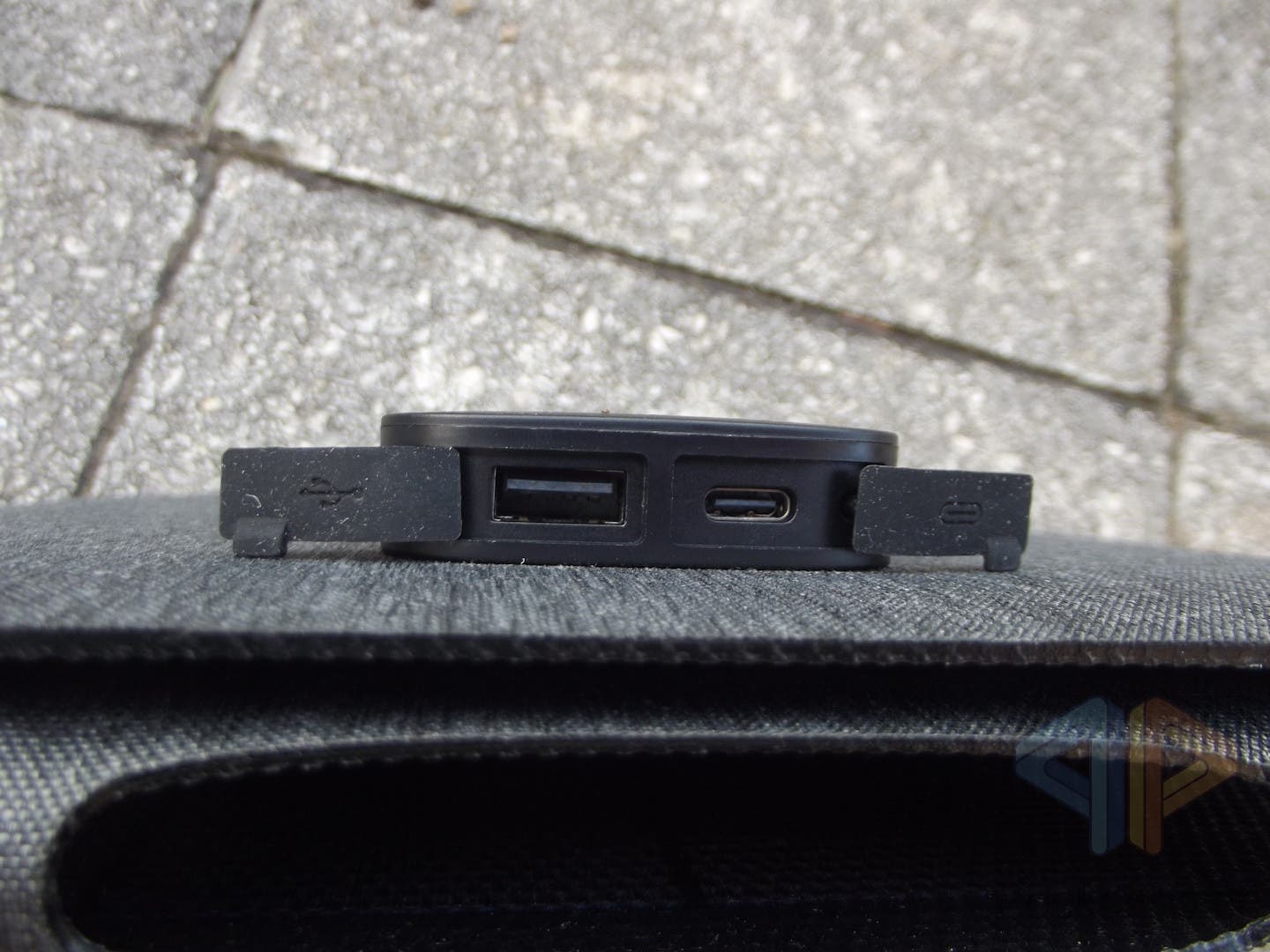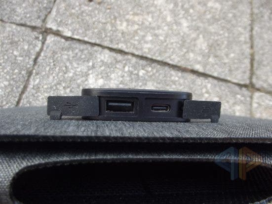 Das Solapanel selbst ist zusammengefaltet 220 x 233 x 42 mm gross und misst aufgeklappt 685 x 222 x 18.5 mm. Das monokristalline Silizium-Panel wiegt 710 Gramm und ist dreigeteilt. Während auf der Vorderseite die drei Solar-Panels in stabilem ETFE-Layer verbaut sind und in dem schwarzen Kunststoffgewebe kaum mehr wie Solarzellen aussehen, finden wir auf der Rückseite einen Kickstand sowie eine kleine Kunststoffbox, in der zwei USB-Anschlüsse untergebracht sind. Unter einer Gummiabdeckung, die jeweils einen Anschluss vor Wasser und Staub schützt, sind hier ein USB-A-Ausgang sowie ein USB-C-Port zu finden. Mit bis zu 20 Watt, namentlich 6.65 V bei 3.0 A. Das sind rechnerisch nicht ganz 20 Watt. Damit kann das Solar-Panel aber auf beiden USB-Anschlüssen separat 5 V mit bis zu 2.4 Ampere maximal ausliefern.