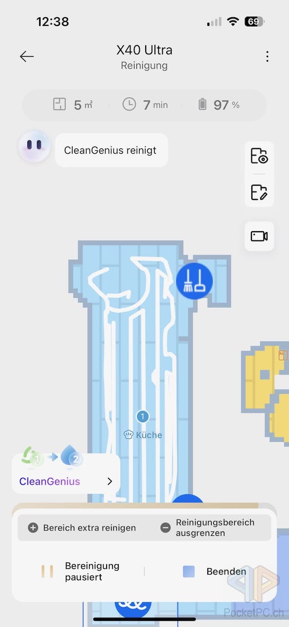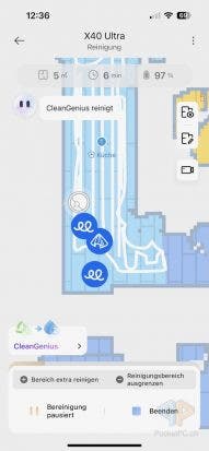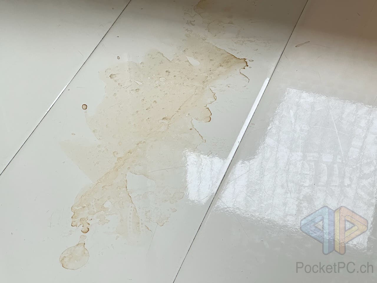 Für einen realistischen Test des CleanGenius-Features wurden absichtlich Kaffeeflecken auf dem Boden verteilt, welche dann eine Woche lang eintrocknen konnten. Bereits bei der Saugfahrt wurden diese erkannt und umfahren. Die Entscheidung der eingebauten KI ist dabei durchdacht, denn es hätte sich auch um eine Nuss-Nugat-Creme handeln können, die man nicht in die Bürsten geschmiert haben möchte. In der anschliessenden Wischfahrt nach dem Saugen ist der Staubsaugerroboter mehrmals über die Kaffeeflecken gefahren, auch wenn bereits die erste Überfahrt nahezu alle Flecken beseitigt hat.