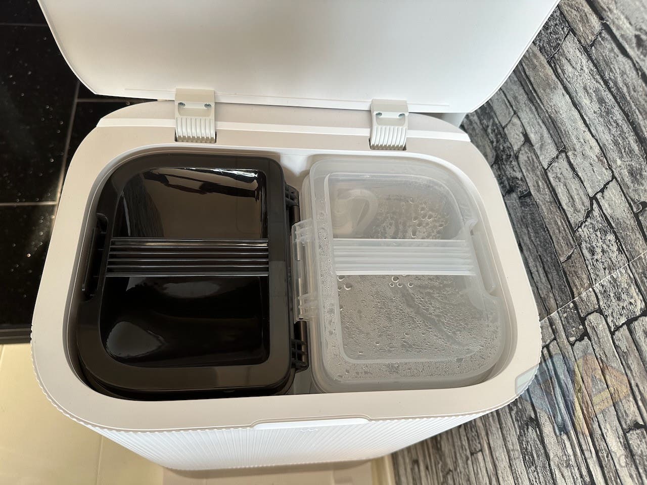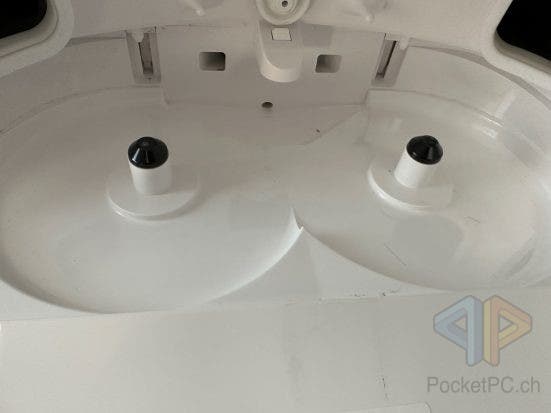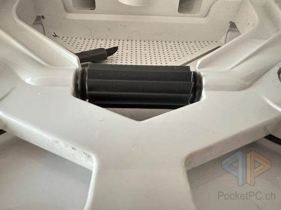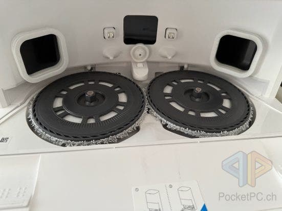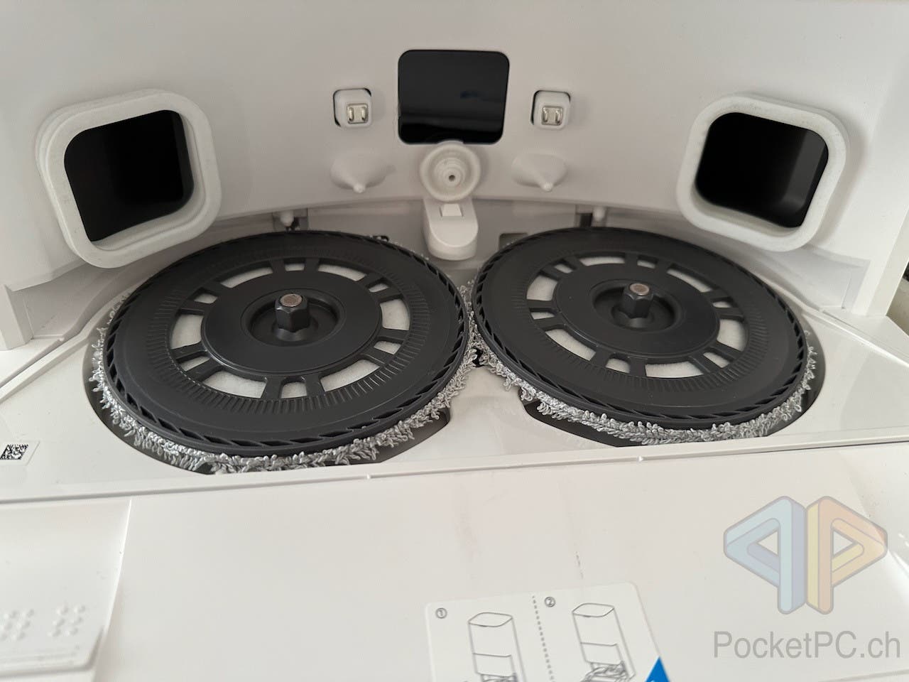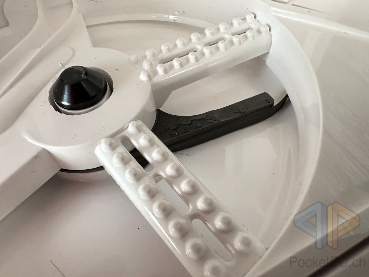 Nach dem Wischvorgang werden die Moppe automatisch mit heissem Wasser in der Basisstation gereinigt. Die Basisstation reinigt die Moppe sehr gründlich ohne sichtbare Rückstände zu hinterlassen. Hierzu befinden sich zwei rotierende Mitnehmer aus Gummi, die rein mechanisch durch die Wischmoppe angetrieben werden, auf der Unterseite des Einsatzes in der Basis. Diese schaufeln das Wasser in Richtung Abfluss und reinigen gleichzeitig den Boden. Ein weiterer Vorteil somit ist, dass kaum Restwasser in der Reinigungswanne zurückbleibt. In unserem Test haben wir die Trocknungszeit auf drei Stunden eingestellt, was zu einem vollständig trockenen Ergebnis der Moppe führte.