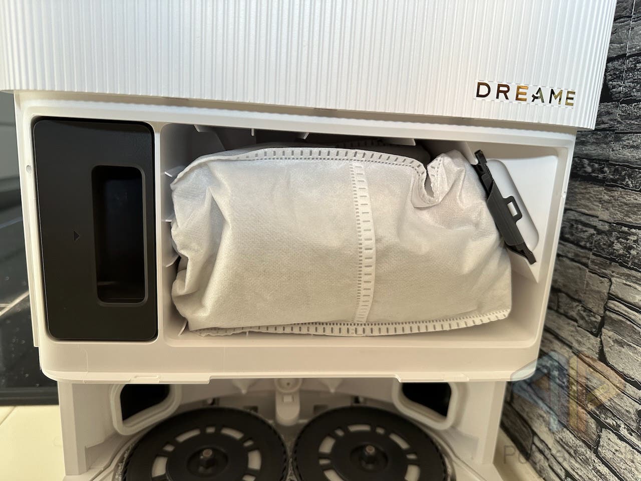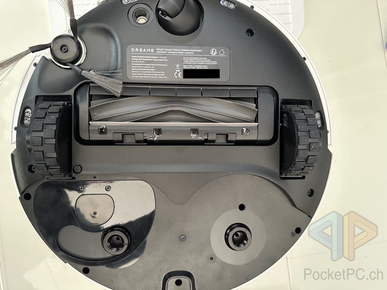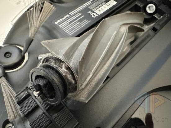 Wischmoppe, Filter, Seitenbürste, Reinigungsmittelkonzentrat gehören zur Standardausstattung. Die Seitenbürste lässt sich wie beim Vorgänger werkzeuglos montieren. Das Reinigungsmittel benötigt nun keine speziell geformte Kartusche mehr zwischen Ab- und Frischwassertank. Der separate Reinigungsmittelbehälter befindet sich neben dem Staubbeutel und ermöglicht das einfache Nachfüllen und die Nutzung von Reinigungsmitteln von Drittanbietern. Dreame empfiehlt jedoch, nur das hauseigene Reinigungsmittel zu verwenden. Die Zugabe kann bei Bedarf per App aktiviert werden und wird in den kleinen Wassertank des Dreame X40 eingespeist. Als Extra legt Dreame noch einen zweiten Staubsaugerbeutel und eine Reinigungsbürste mit integriertem Cutter für Haare bei, mit der man auch die Basisstation reinigen kann.