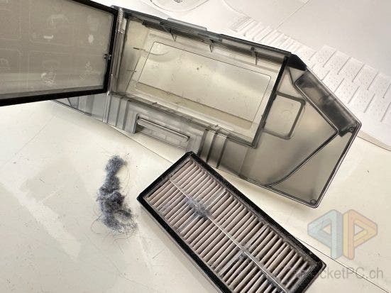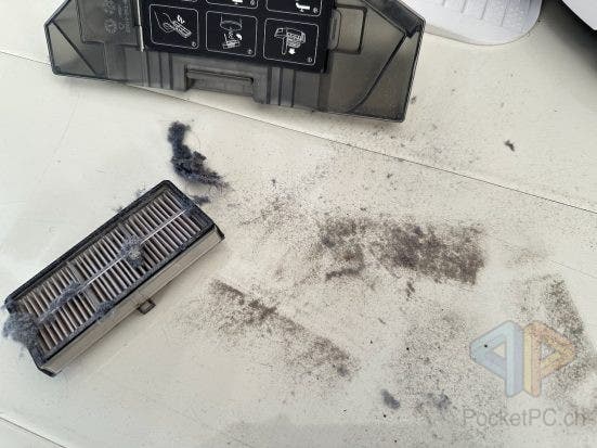 Die Hauptbürste lässt sich sehr einfach von Schmutz oder auch aufgewickelten Haaren befreien, indem man die seitlichen Halter abzieht. Selbst nach 30 Tagen mit täglichen Saugfahren ist der kleine interne Staubbehälter noch sehr sauber. Wie viel Feinstaub der Filter sammelt, hat dessen Ausklopfen eindrucksvoll gezeigt. Der grosse Staubsack in der Station wird nach eigenem Ermessen getauscht. Den Füllstand kann man durch leichtes Drücken sehr gut bestimmen.