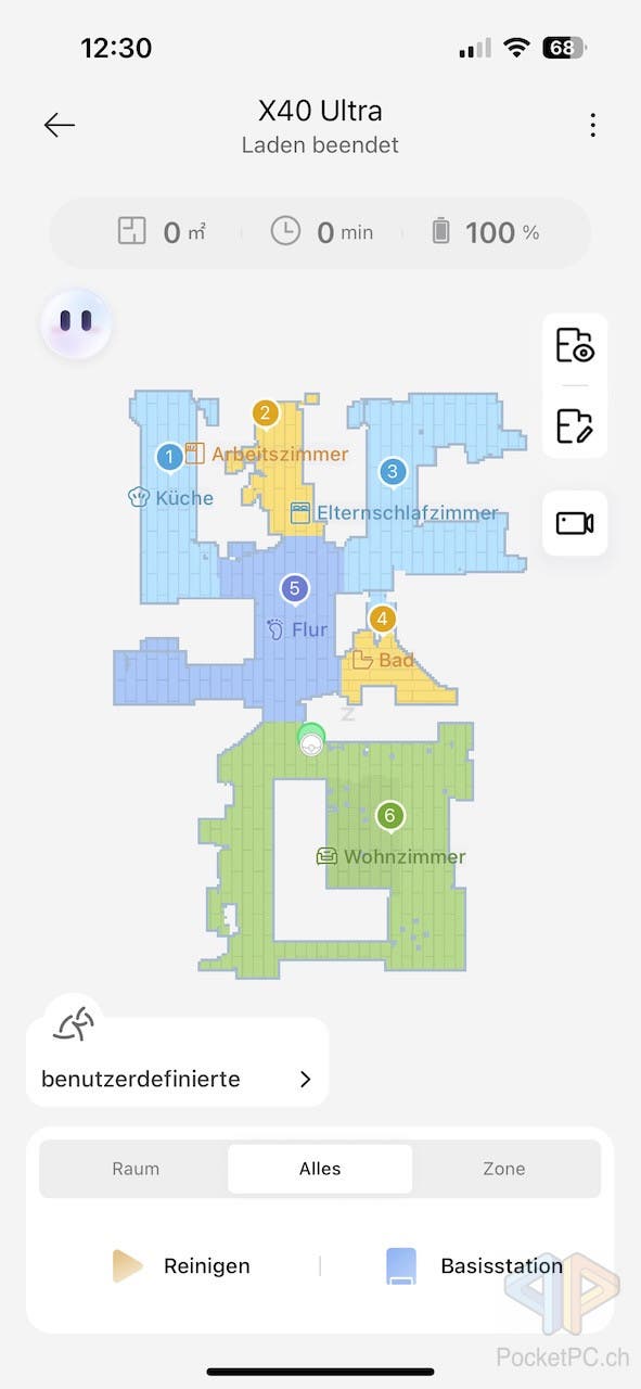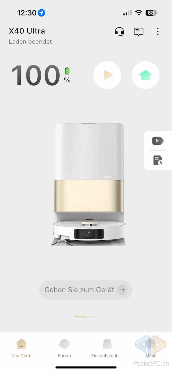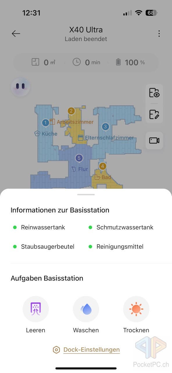 Die App bietet eine intuitive Benutzeroberfläche, die es ermöglicht, den Staubsauger zu steuern und verschiedene Reinigungsmodi auszuwählen. Im ersten Schritt muss das Gerät in die Basistation fahren, wahlweise per App oder mit einem Druck auf den Home-Button auf der Oberseite. Nun können evtl. verfügbare Firmware-Updates installiert werden, die den Staubsauger auf die neueste Version bringen, natürlich erhält man dann eine entsprechende Meldung in der App. Für den ersten Einsatz muss der Dreame X40 zunächst eine Erkundungsfahrt durch die Räume absolvieren. Nach anschliessender Rückkehr in die Basistation wird er Erfolg per Sprache und Benachrichtigung in der App gemeldet.