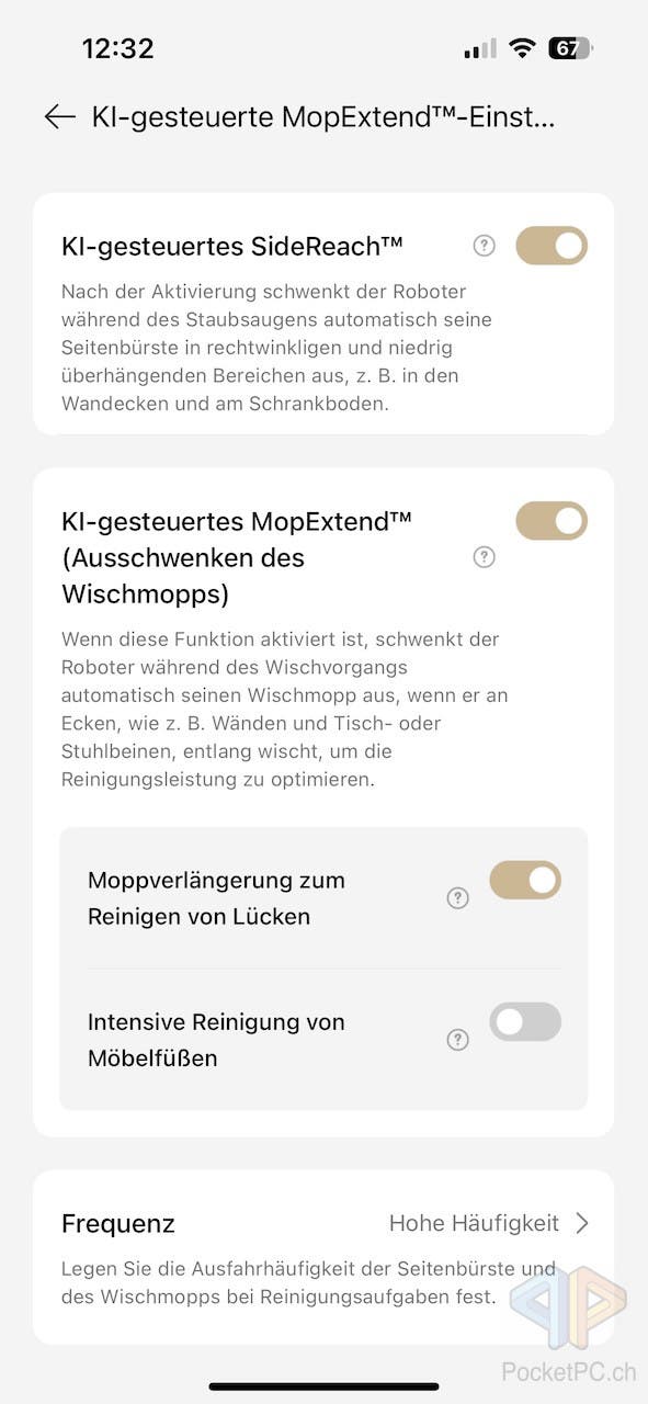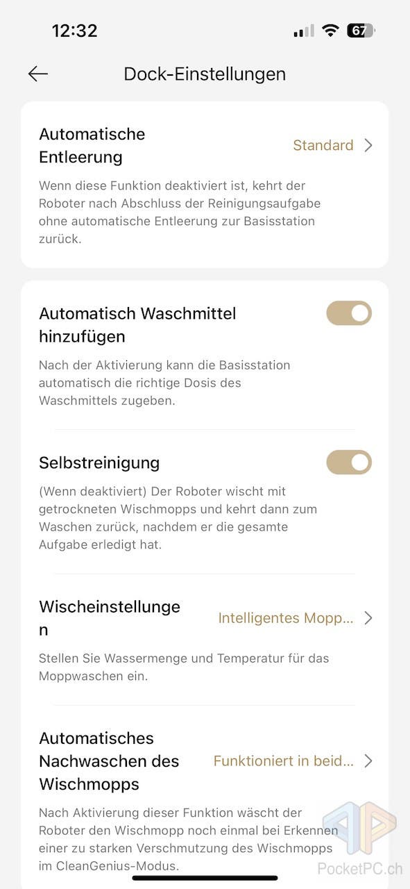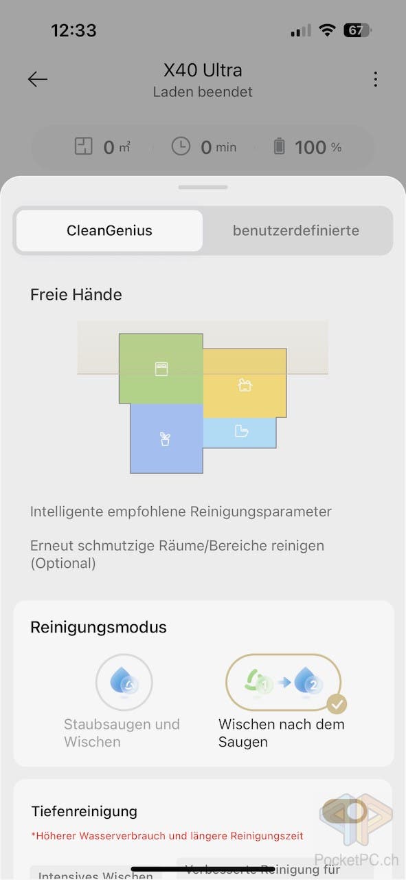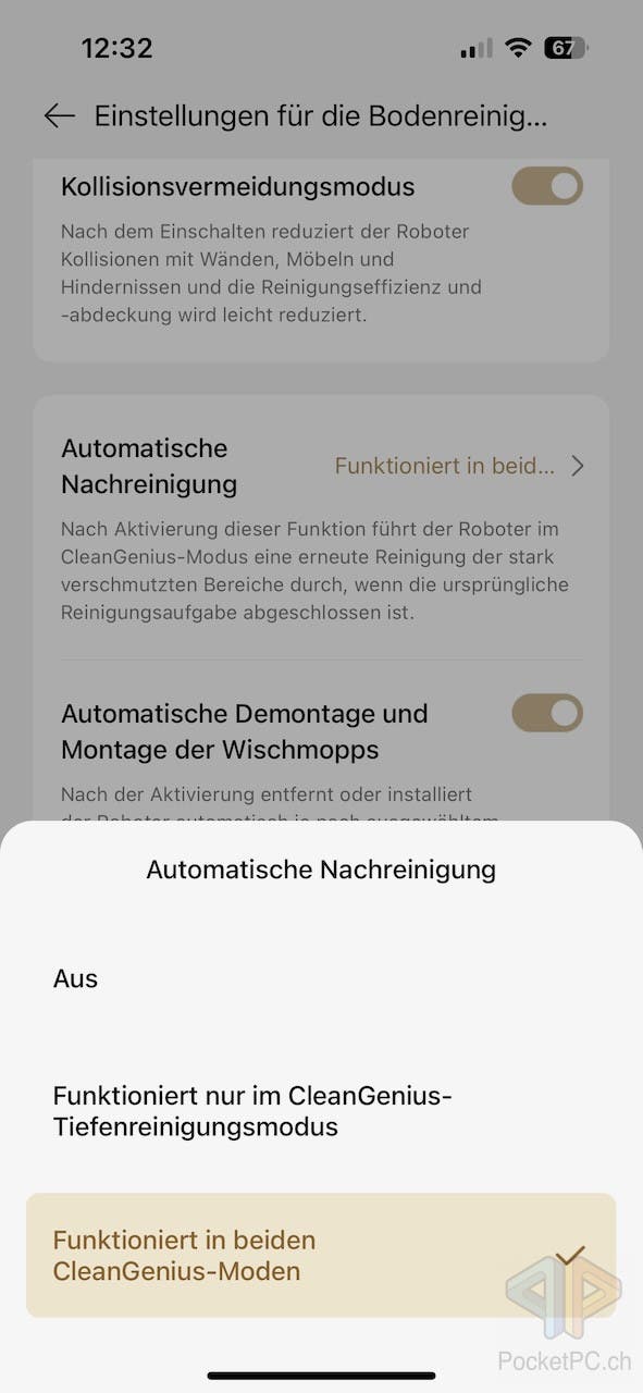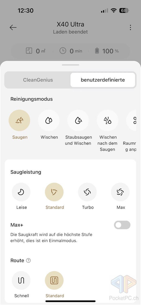 Möchte man die Reinigungsparameter lieber individuell einstellen, so kann man dies über die App in einer sehr feingranularen Tiefe den eigenen Bedürfnissen entsprechend anpassen. Ein kleiner Nachteil ist allerdings, dass die Tiefenreinigung nur im CleanGenius-Modus aktiviert werden kann.