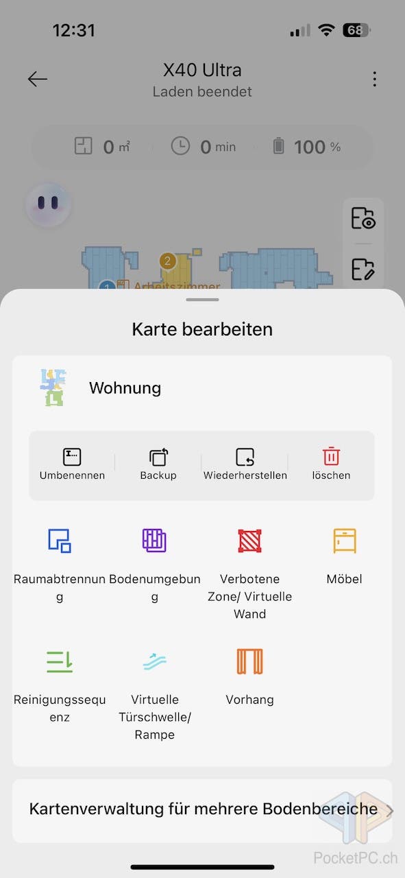 Über das kleine Kartensymbol mit einem Stift rechts in der Mitte wird das Menü zur Kartenbearbeitung aufgerufen. Dreame stellt eine Vielzahl an Möglichkeiten zur Verfügung, um die Karte zu bearbeiten. Raumabtrennungen, Raumnamen, verbotene Zonen, die nicht befahren werden sollen, virtuelle Wände, Möbel, Türschwellen und sogar Vorhänge können definiert werden. In dieser Maske kann man unten in der Verwaltung für mehrere Bodenbereiche wechseln. Diese Option ist nicht nur für mehrstöckige Häuser, bzw. Wohnungen interessant, sondern auch wenn Bereiche innerhalb der Etage, beispielsweise über eine ein- oder zweistufige Treppe getrennt sind. Diese Einzelbereiche können dann in der App als jeweils neue Karten definiert werden. Dieses Feature konnten wir im Test allerdings nicht erproben, da unsere Räumlichkeiten nicht so komplex sind. Anderen Berichten zufolge ist dieses Feature jedoch sehr praktisch. Es gilt aber zu beachten, dass vor dem Reinigungsstart die jeweils entsprechende Karte ausgewählt werden muss.
