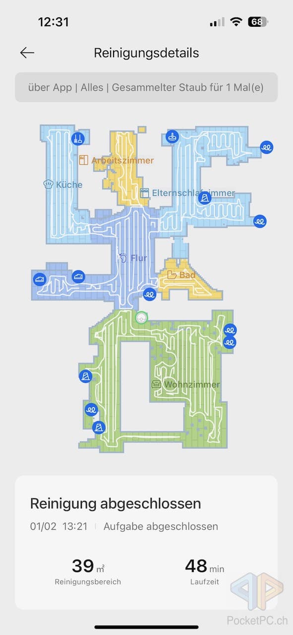 Allerdings gibt es auch einige Schwachstellen: Die Inbetriebnahme gestaltete sich in unserem Fall durch Probleme mit der initialen Einrichtung per QR-Code. Die Tiefenreinigung ist ausschliesslich im CleanGenius-Modus verfügbar, was die Flexibilität einschränkt. Auch wurde die praktische Funktion zum einfachen Herausfahren aus der Station, die beim Vorgänger noch über Tasten verfügbar war, ersatzlos gestrichen. Auch Tasten an der Reinigungsstation sucht man vergeblich. Die verfügbaren Alternativen sind dabei deutlich umständlicher und ein Nachrüsten in der App sollte technisch eigentlich problemlos möglich sein.