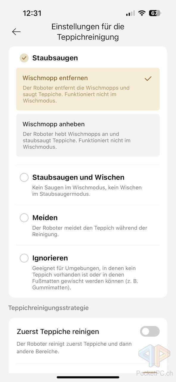 Selbst bei komplexen Raumlayouts bewährt sich die Lidar-Navigation, die den Reinigungspfad effizient plant. Kurzflorige Teppiche werden ohne Navigationsschwierigekiten befahren. Der integrierte Teppichsensor erkennt den Bodenbelag und passt die Reinigungseinstellungen entsprechend an, sofern man es in den Einstellungen unter “Einstelllungen für die Teppichreinigung” aktiviert. Bei Bedarf kann man die Teppichreinigung sogar noch weiter individualisieren. Die wohl auffälligste Neuerung ist, dass die Reinigungsmoppe in der Station gelassen werden können. Ohne zusätzliche Friktion dieser Moppe hat der Reinigungsroboter sichtlich weniger Widerstand beim Fahren. Je länger der Flor des Teppichs ist, desto mehr Navigationsprobleme entstehen.