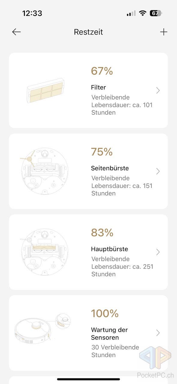 Um die Leistung des Dreame X40 aufrechtzuerhalten, sind regelmässige Wartungsarbeiten erforderlich. Dazu gehört die Reinigung der Sensoren und Austausch der Filter, die einfach zugänglich sind. Die App erinnert an anstehende Wartungsarbeiten, um sicherzustellen, dass der Staubsauger stets optimal funktioniert. In den Einstellungen unter “Restzeit” kann man die Restzeit der Filter und Sensoren einsehen. Filter, Seitenbürsten und weiteres Zubehör lassen sich einfach über Amazon nachbestellen.