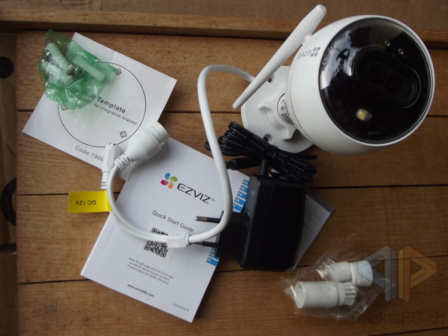 Die EZVIZ C3X Outdoor WLAN-Kamera wird geliefert mit einer mehrsprachigen Kurzanleitung, darunter auch Deutsch und Französisch. Zudem ist eine Bohrschablone für die eingebaute dreh- und schwenkbare Halterung vorhanden, ein Set Dübel und Schrauben, ein 12-V-Netzteil mit 1.5 m Kabel und ein wasserdichter Verschluss für den Ethernet-Anschluss.