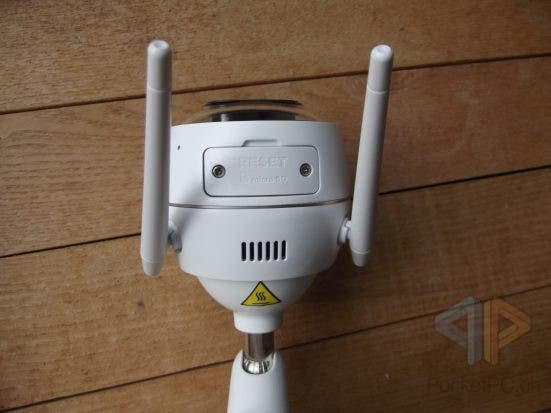 Auf beiden Seiten der Kamera ist je eine Neigbare WLAN-Antenne angebracht.