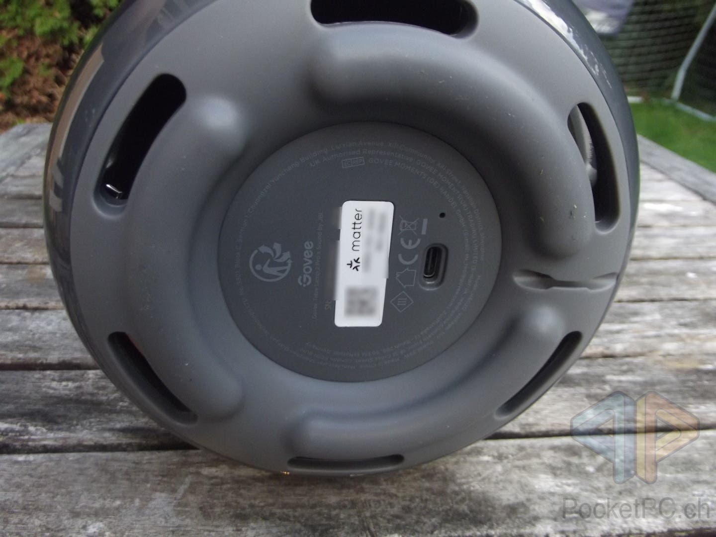 Auf der Unterseite befindet sich der USB-C-Ladeanschluss sowie der Aufkleber mit dem Matter-QR-Code und der dazugehörigen Zahlenkombination. Zudem ist hier ein Reset-Taster zu finden.