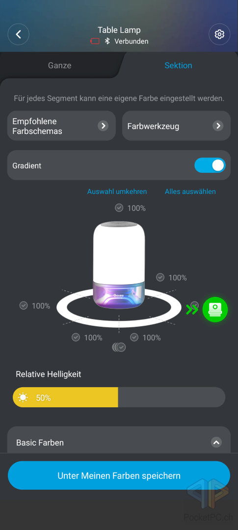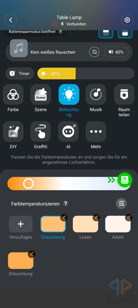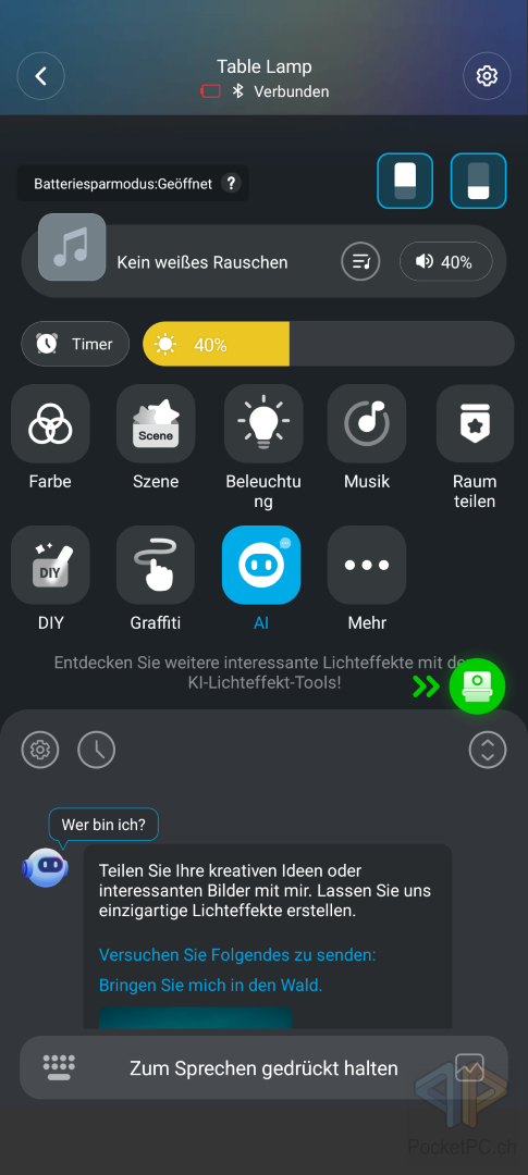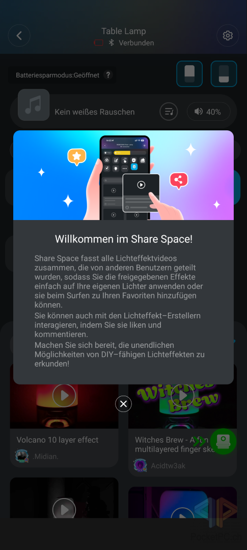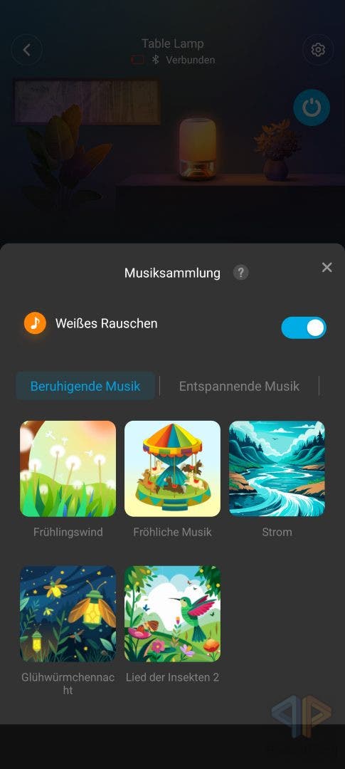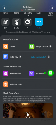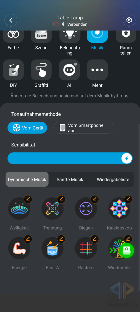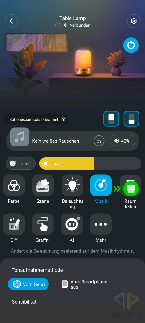 Richtig Spass macht die Screenshot Govee Table Lamp 2 Pro x Sound by JBL aber vor allem mit Musik. Dazu wird die Lampe via Bluetooth gekoppelt, wobei leider nur herkömmliches SBC zur Verfügung steht. Hochaufgelöstes Audio ist auf dem Mono-Speaker, trotz JBL als Hersteller dahinter, leider nicht möglich. Neben den 64 Szenen-Modi stehen auch 16 unterschiedliche Musikmodi zur Verfügung. Dabei kann auch ausgewählt werden, ob die Govee Leuchte das eigene Mikro benutzen soll, um Rhythmus und Ton zu erkennen, oder auf das Smartphone zurückgreifen darf.