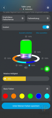 Durch die verwendete LED-Technologie mit RGBICWW und RGBIC ist warmweisses Licht ebenso möglich wie knallige Farbeffekte. Die Helligkeit beträgt maximal 600 Lumen, was schon ganz schön hell ist für eine so kleine Tischlampe. Die Farbtemperatur beträgt hier zwischen 2700 K und 6500 K.