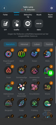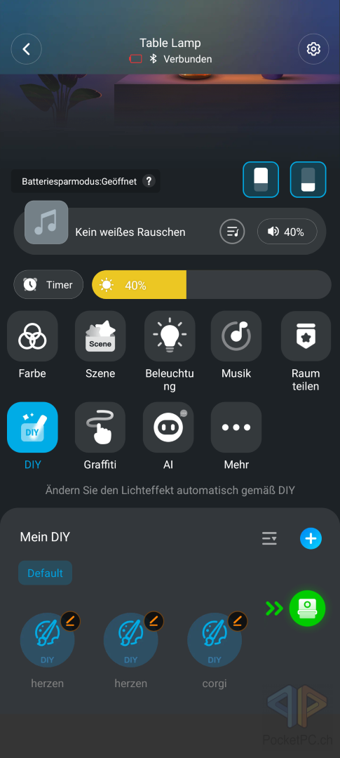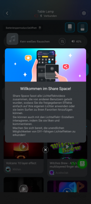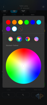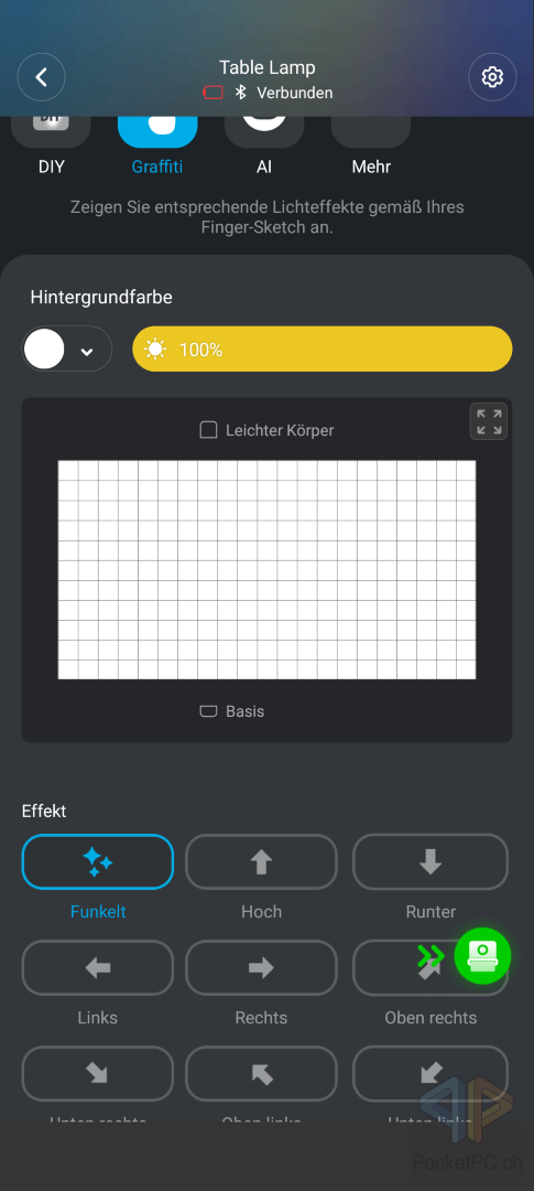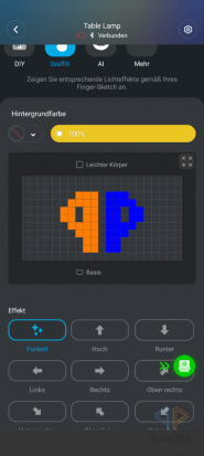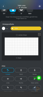 In der App kann nicht nur die Tischlampe verbunden und der Matter-Modus aktiviert werden. Hier sind auch alle möglichen Einstellungen vorhanden. So kann aus über hundert voreingestellten Lichtszenen von Party bis Entspannung gewählt werden. Auch eigene Effekte, Motive und Bilder können pixelgenau konfiguriert werden. Helligkeit und Farbtemperatur sowie die Geschwindigkeit und Richtung der Effekte sind ebenso alle einstellbar. Für eigene Bilder stehen 11 x 21 Pixel zur Verfügung. Muster können so wiederholt, verschoben oder auch funkelnd animiert werden.