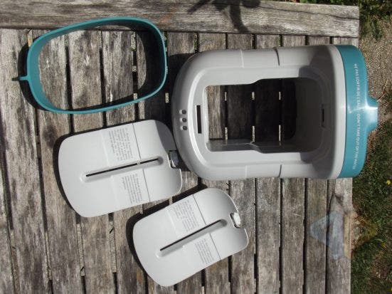 Dazu wird das türkise Gummiband, an dem eine Öse zur Befestigung des Chlordosierers im Pool selbst vorhanden ist, abgenommen und schon kann eine der beiden Kappen geöffnet werden. Dahinter können bis zu fünf Chlortabletten zu je 200 Gramm oder drei zu je 250 Gramm eingelegt werden. Diese sind beim belgischen Unternehmen iopool erhältlich oder in jedem gut sortieren Schimmbadbedarf.