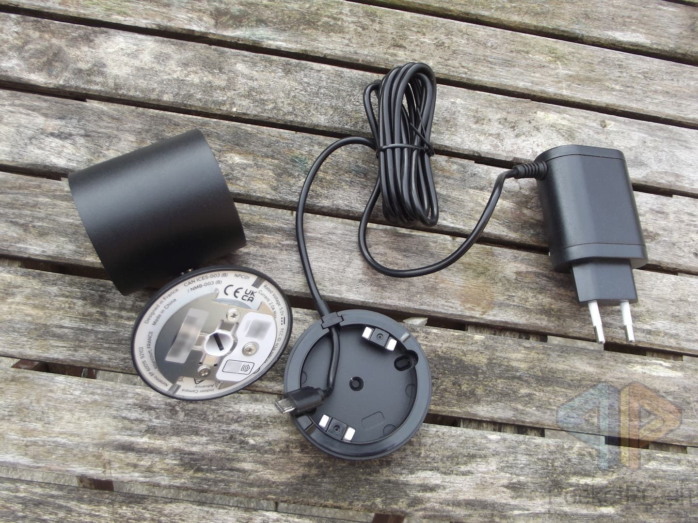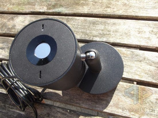 Die Netatmo Innenkamera Advance ist 65 x 65 x 115 mm gross und wiegt 313 Gramm mit Ständer aber ohne Netzteil. Kamera und Ständer sind aus einem einzeiligen Aluminium und hochbeständigem Kunststoff gefertigt und kommen in Schwarz oder Weiss daher. Am fest installierten Kugelgelenk kann die Netzwerkkamera von Netatmo beliebig geschwenkt werden. Der Ständer mit gummiertem Fuss dient gleichzeitig als Wandhalterung. Er kann um gut 110 Grad gedreht werden, so dass das Kabel in die Richtung zeigt, die man möchte und ebenso durch Drehung abgenommen werden. Darin sind sodann drei Öffnungen für Schrauben zu finden sowie am Ständer der Kamera selbst ein QR-Code mit der Seriennummer und nochmals der Apple HomeKit Setup-Code. Der microUSB-Stecker wird in den Hals der Halterung gesteckt und weil er, im Gegensatz zu USB-Typ-C nicht rotationssymetrisch ist, wurde der Stecker von Netatmo mit einer seitlichen Kerbe ausgestattet, so dass er nicht versehentlich falsch eingeführt werden kann. Einen Akku sucht man bei der Netatmo Innenkamera Advance vergeblich.