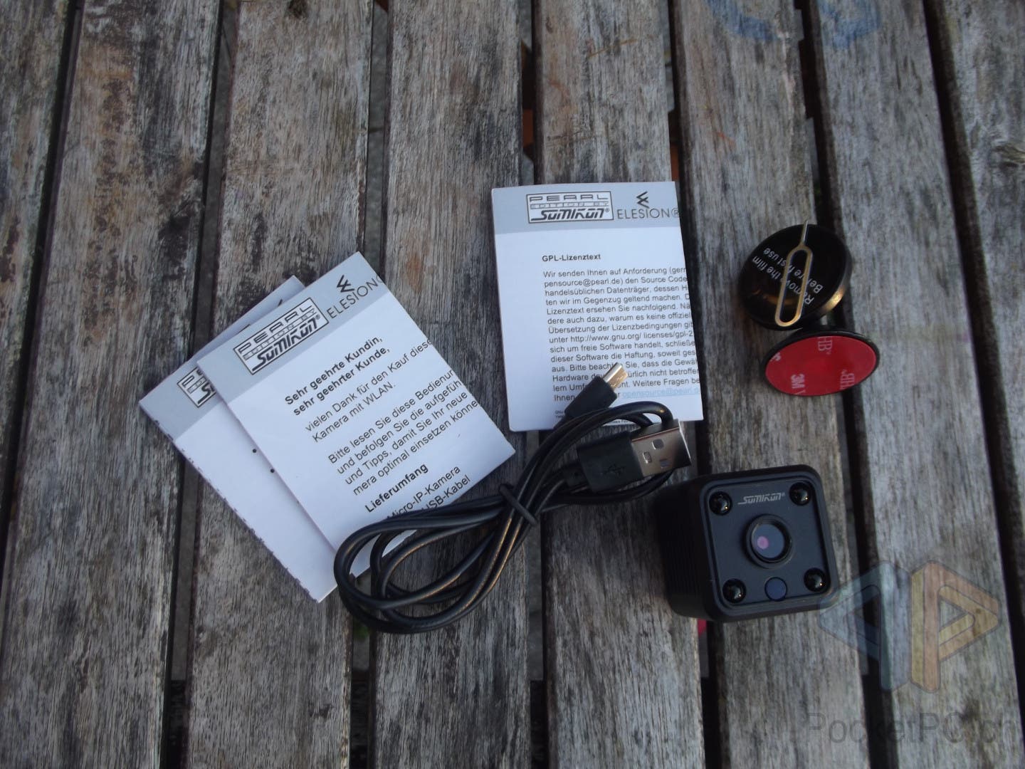 Die PEARL Somikon DV-715.cube Kamera wird geliefert mit einem microUSB-Kabel von 80 cm Länge, Reset-Pin und deutscher und französischer Schnellstartanleitung, GPL-Hinweisen und einer kleinen, magnetischen Halterung mit Kugelkopfscharnier. Am Fuss der Halterung ist ein 3M Doppelklebeband angebracht.