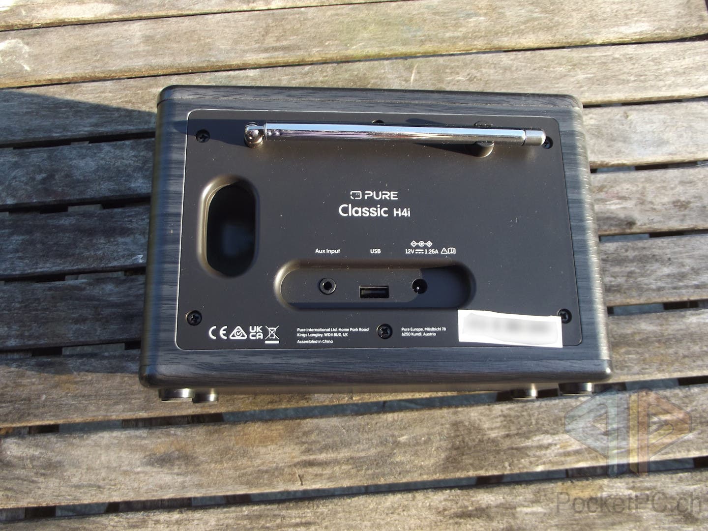 Der Pure Classic H4i ist 1.2 kg leicht und misst 140 x 285 x 117 mm. Das in Schwarz und Esche gehaltene Gerät empfängt DAB-Signale von 175 bis 240 MHz und ist damit nahezu weltweit einsetzbar. Daneben kann das Radio klassisch Ultrakurzwelle (UKW bzw. englisch FM) empfangen. Dafür liegt der Frequenzbereich von 87.5 MHz bis 108 MHz an; wie gehabt. Hinzu kommt Bluetooth 5.3 zum Audioempfang und ein 3.5-mm-Stereoklinkeneingang auf der Rückseite. Dort sind auch der USB-Anschluss und der Stromeingang für das mitgelieferte Netzteil mit 12 V und 1.25 A, also 15 W, untergebracht und zudem die ausziehbare Teleskopantenne verbaut.
