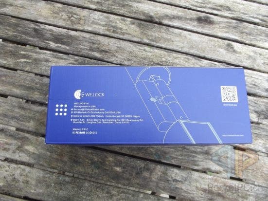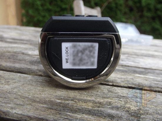 Auf der abgeflachten Vorderseite befindet sich ein QR-Code für die App-Einrichtung auf einer Plastik-Klappe. Dieser enthält die Seriennummer des Schlosses, das auch seitlich auf dem Profilzylinder eingeprägt ist.