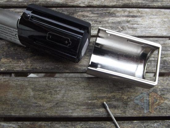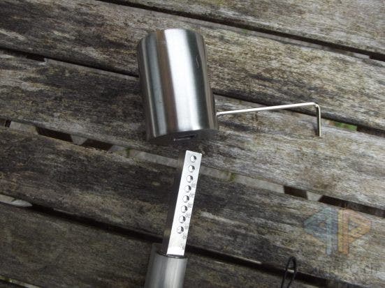 Der Aussenknauf kommt mit einem Durchmesser von 44 mm und ist 56 mm lang. Er besteht aus Kunststoff und hat einen Edelstahlhülle, die mittels seitlicher Innensechskantschraube entfernt werden kann. Auch dieser Knauf ist justierbar und kann von 40 mm bis 55 mm eingestellt werden.