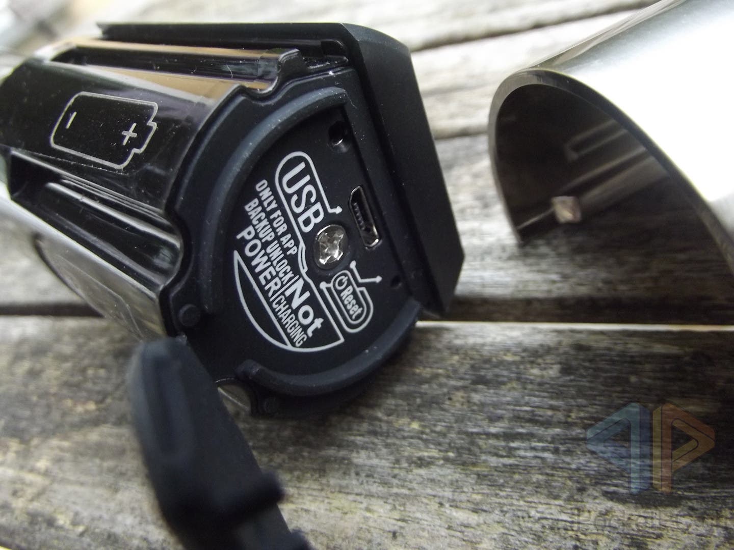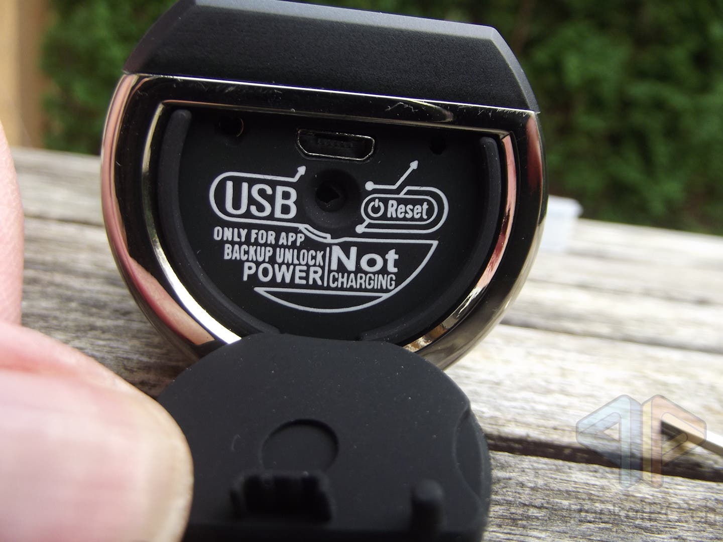 Darunter ist ein micro-USB-Anschluss zur Notöffnung und Notstromversorgung angebracht sowie ein Loch für den Reset-Taster. Mit dem USB-Anschluss kann man jedoch das Schloss lediglich im Notfall aufschliessen per App. Es dient nicht der reinen Stromversorgung und schon gar nicht zum Aufladen der Batterien.