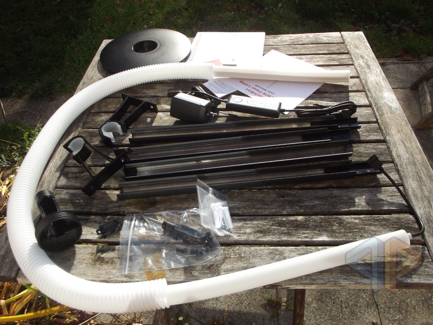 Die Lampe selbst besteht aus einem Leuchtkörper in Form eines RGB-Lichtstreifens mit Silikonabdeckung. Er kommt in einem weissen Kunststoffschlauch, der jedoch nur zum Transport dient. Zudem ist das Gehäuse eine schwarz lackiere Halbröhre, die aus vier Teilen besteht. Sie wird zusammengesteckt und mit passenden Metallschrauben, die ebenfalls im Karton enthalten sind, fixiert. Den entsprechenden Schraubenzieher bekommt man von SwitchBot ebenfalls mit dazu. Ein Endstück mit Gewinde, dass die Lampe im runden Metallsockel hält, der auch mit im Lieferumfang zu finden ist, sowie ein Steckernetzteil mit 12 V und 1.5 A Ausgangsspannung sowie einem Kabel von drei Metern Länge mit dem altbekannten Steuergerät der SwitchBot RGB-Leuchten, eine Kurzanleitung, Garantiekärtchen und Registrierungshinweis sowie die Montageanleitung sind ebenfalls mit dabei.