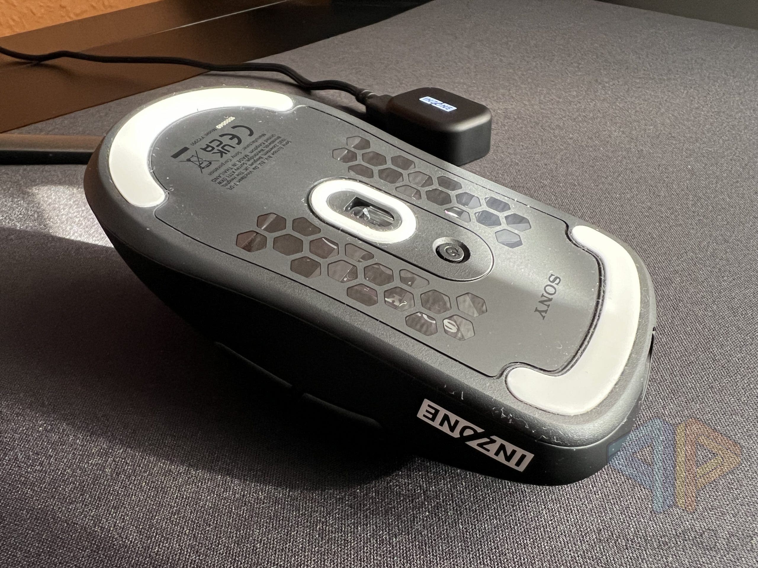 Dass Sony beim überaus überraschenden Gewicht gespart hat, merkt man der Maus aber auch deutlich an. Sie fühlt sich sehr hol an, aber nicht minderwertig. Unten ist eine wabenförmige Struktur eingefräst, die noch mehr Gewicht spart, da weniger Material zum Einsatz kommt. Die Buttons sind leichtgängig, klicken aber satt genug für Feedback ein. Sie liegt dabei sehr gut in der Hand, aber meine Hände sind auch in etwa mittelgross, wenn man das so nennen kann und das ist irgendwie eine ziemlich gute Grösse für viele Mäuse. Dank des Universal-Designs zeigt sich die Inzone Mouse-A im Test auch für Linkshänder geeignet, aber dann ist der Zugriff auf die Seitentasten schwieriger.
