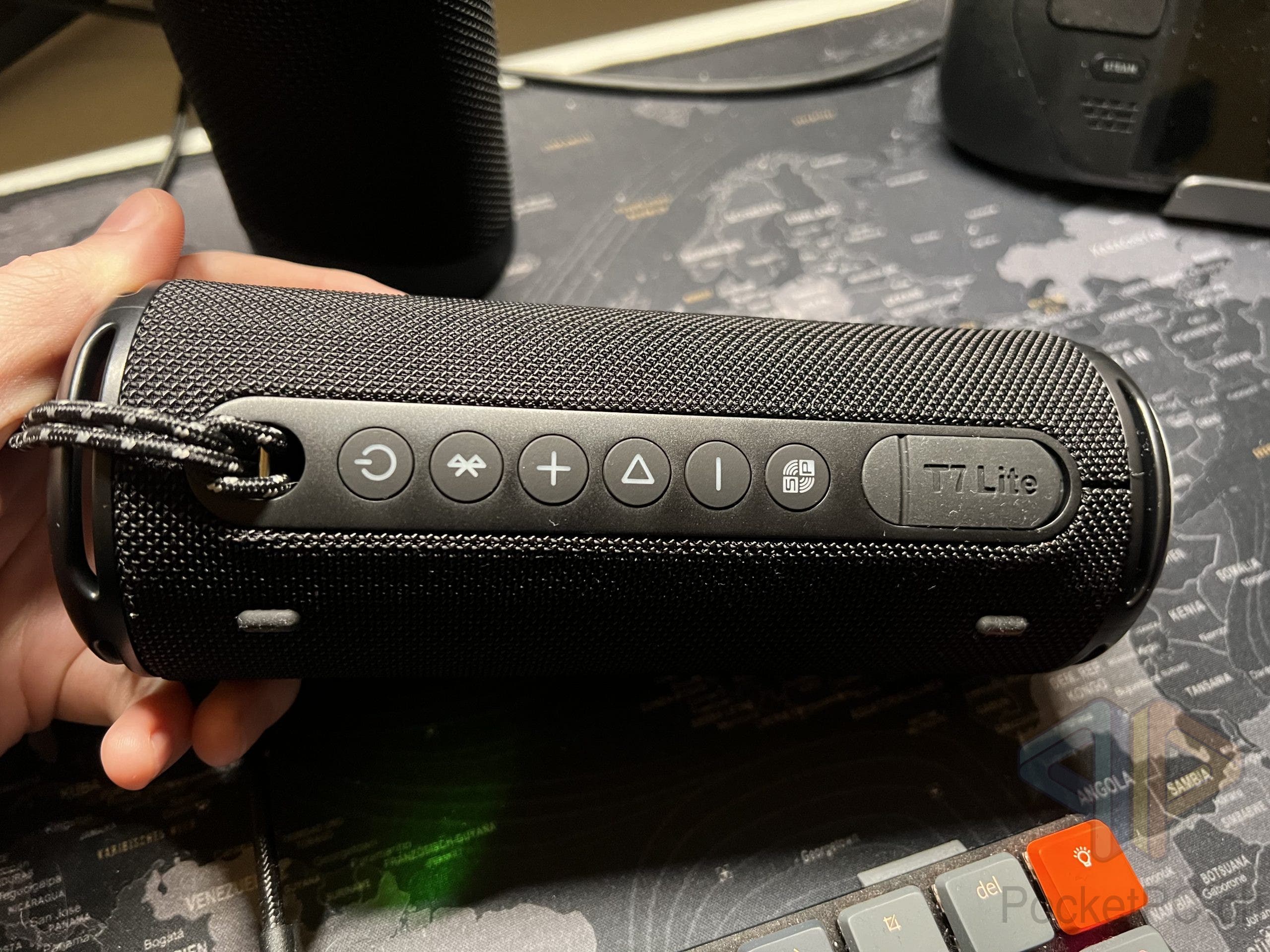 Die Bedienelemente sind wieder an der Seite angebracht und fühlen sich bei weitem besser an, als beim grösseren Modell. Sie sind deutlich “griffiger” und lassen sich auch besser klicken. Das liegt aber vor allem daran, dass diese einzeln ausgelegt sind und nicht unter einer einheitlichen Gummifassade liegen. So lassen sich diese auch etwas leichter als einzelne Buttons erfühlen. Ebenfalls wieder mit dabei und auch ein Pluspunkt ist die nach IPX7-Standard zertifizierte Spritzwasserfestigkeit. Damit kann der Tronsmart T7 Lite auch einen kleinen Regenschauer überstehen.