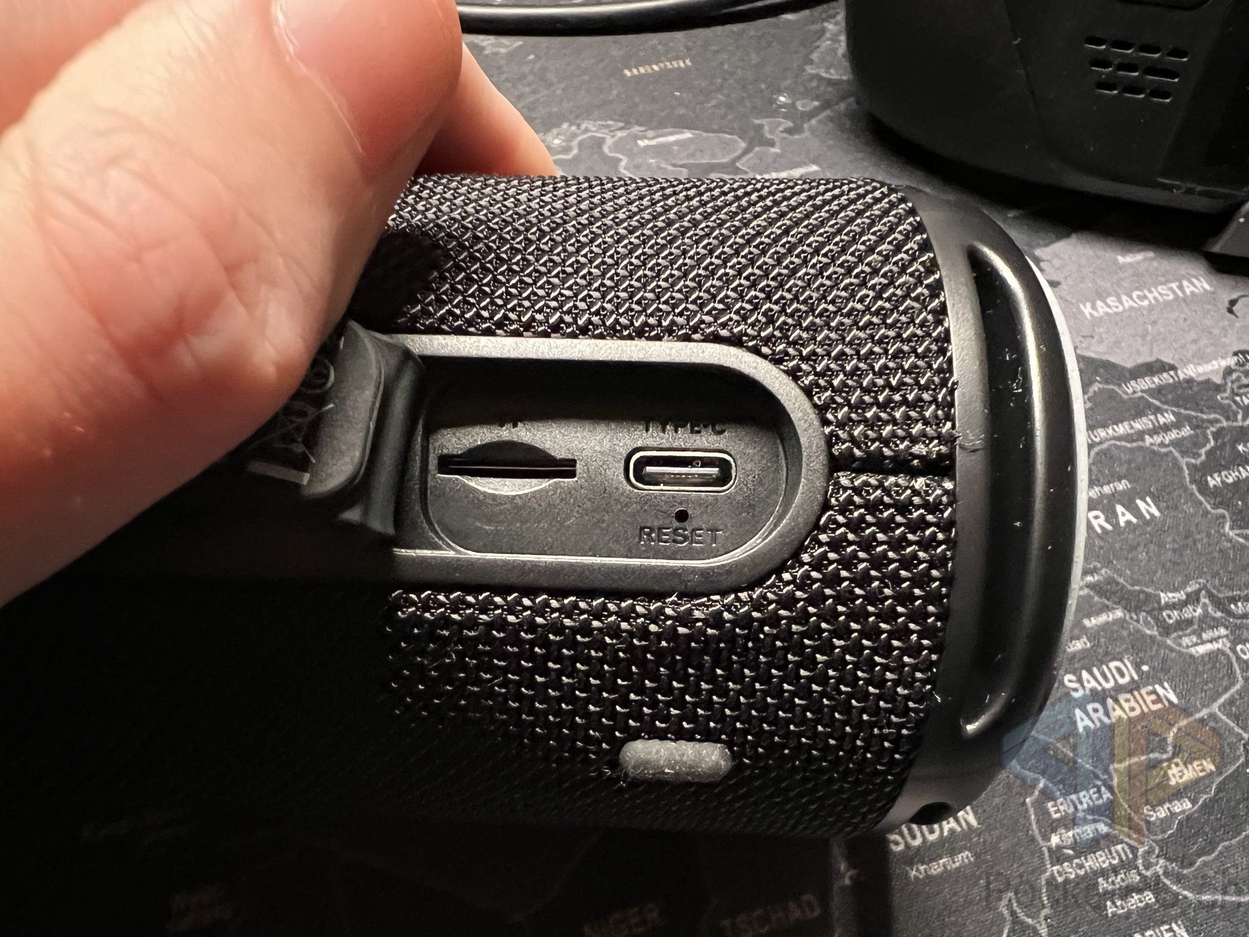Die Ausstattung des Tronsmart T7 Lite zeigt sich im Test vor allem bei den Lautsprechern grundlegend anders als beim deutlich grösseren Non-Lite-Modell. Es kommen zwei Universal-Treiber zum Einsatz (Hochtöner) und gleich drei passive Radiatoren. Löblich: Es kommt wieder Bluetooth 5.3 zum Einsatz und ihr könnt microSD-Karten in den Speaker stecken, um Songs auch unabhängig einer kabellosen Verbindungen abspielen zu können. Wieder prominent besetzt ist der SP-Knopf, der die Tonlage etwas ins “Weite” schiessen lassen kann, aber dazu gleich mehr. Unterstützt wird übrigens auch wieder Stereo-Pairing, also der Koppeln zweier Lautsprecher gleichzeitig.