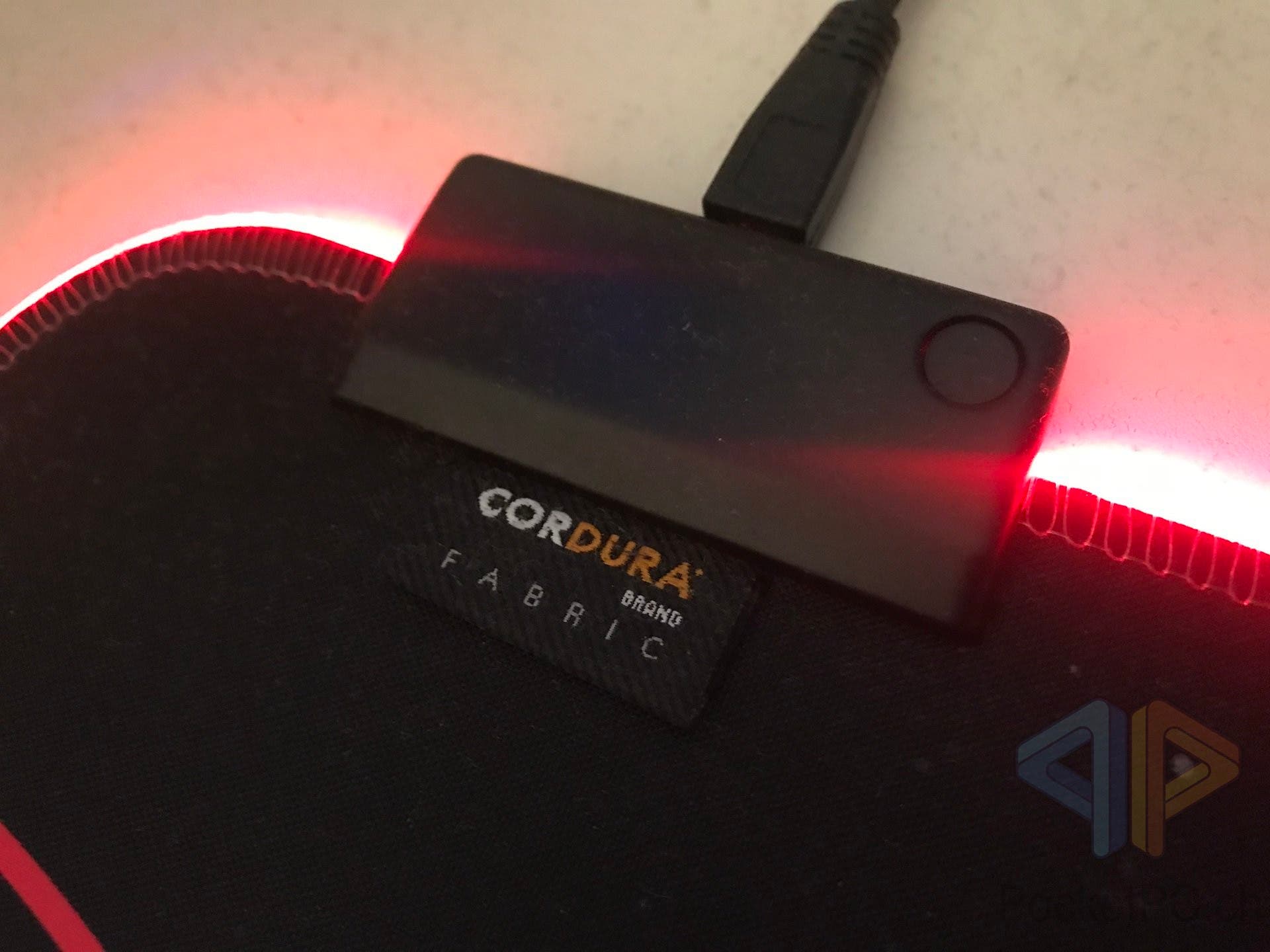 Diese ist in mehreren Stufen einstellbar und zeigt auf Knopfdruck jeweils eine andere Farbe an. Dafür muss das Mauspad auch per USB am PC eingesteckt werden, was euch natürlich einen Steckplatz klaut. Wer viele USB-Slots oder einen grösseren USB-Hub nutzt, wird damit aber zurechtkommen.