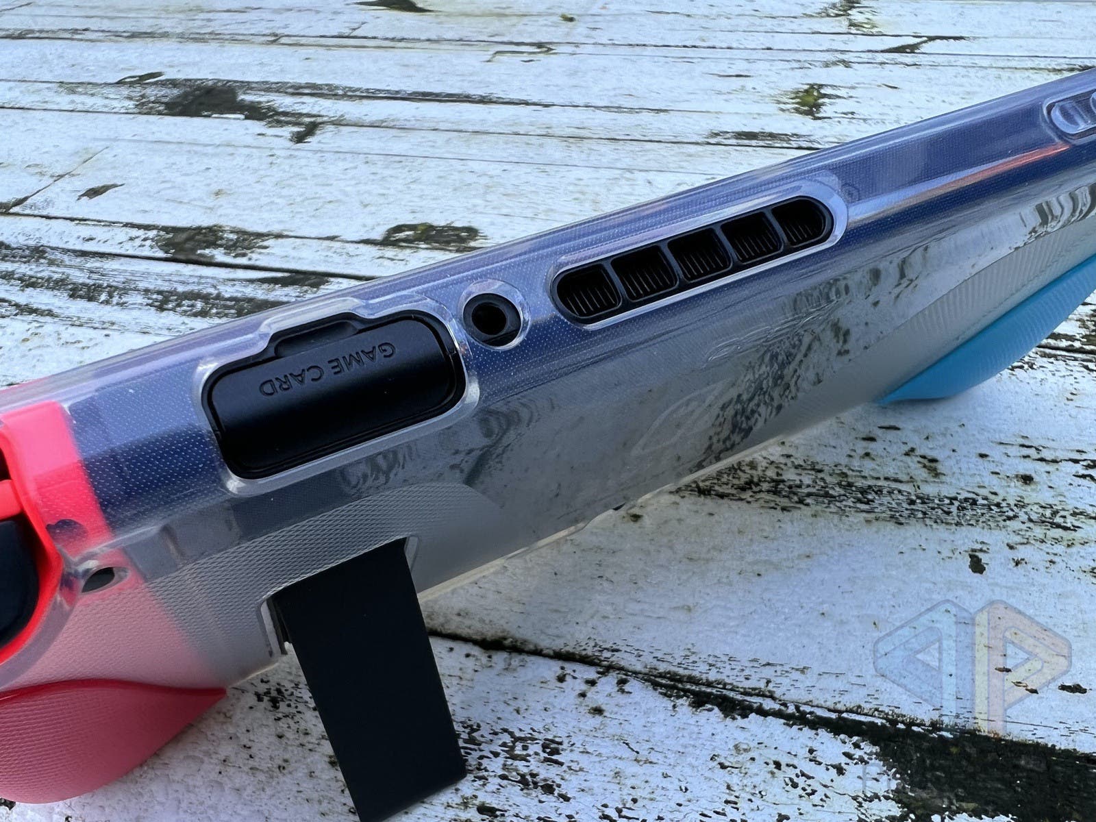 Besonders gut gefallen haben mir übrigens auch die cleveren Einschnitte. Der Kickstand ist ebenfalls erreichbar und damit auch der microSD-Slot sowie der Kartenschacht für die Spiele. Kopfhörer und USB-C können auch ohne Probleme angeschlossen werden. Geschützt hingegen bleiben die Tasten oben für Lauter und Leiser sowie der Power-On-Knopf. Drücken könnt ihr sie aber dennoch. Ihr büsst also keinerlei Funktionalität ein und bekommt einen starken Grundschutz inklusive einer wesentlich handlicheren Bedienung durch die vergrösserten Griffflächen.