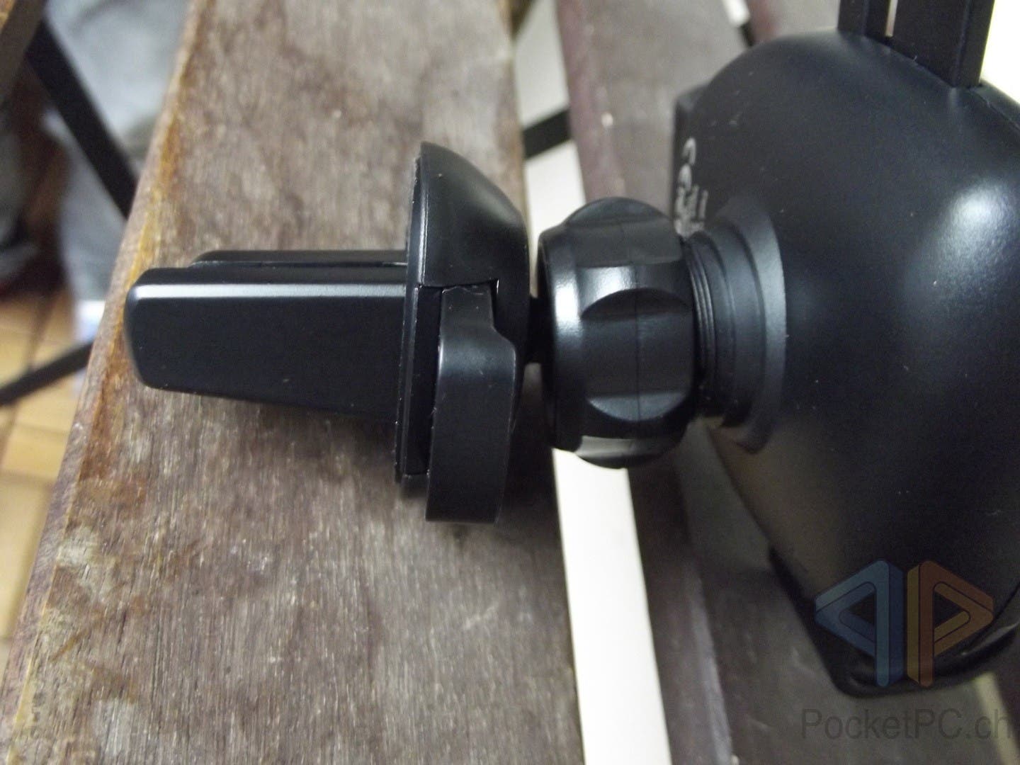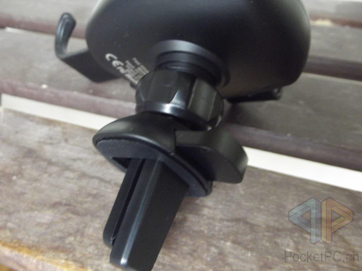 Der Choetech Fast Wireless Car Charger 10 W verfügt über ein 360° drehbares Kugelgelenk-Scharnier. Daran findet sich ein mechanischer Klipp mit Gummipolstern, mit dem die Ladehalterung am Lüftungsschlitz im Auto festgeklemmt wird. Das funktioniert tadellos und zuverlässig. Ein Druck auf den Öffnungs-Hebel spreizt die Klemme auf, so dass sie ins Lüftungsgitter eingeführt werden kann. Dann einfach loslassen und basta. Den Winkel der Handyhalterung kann man am einfachsten anschliessend am der grossen Drehmutter am Kugelgelenk fest einstellen.