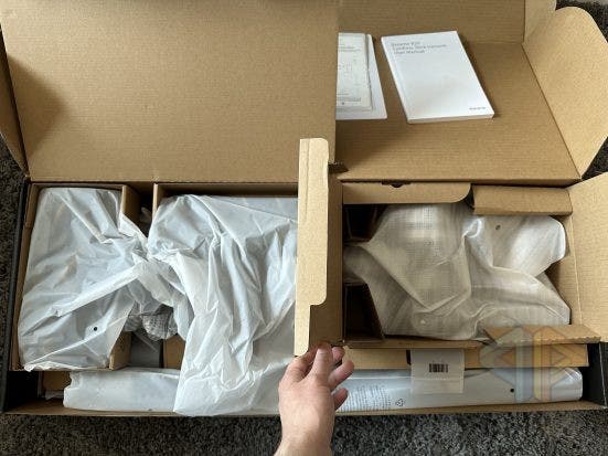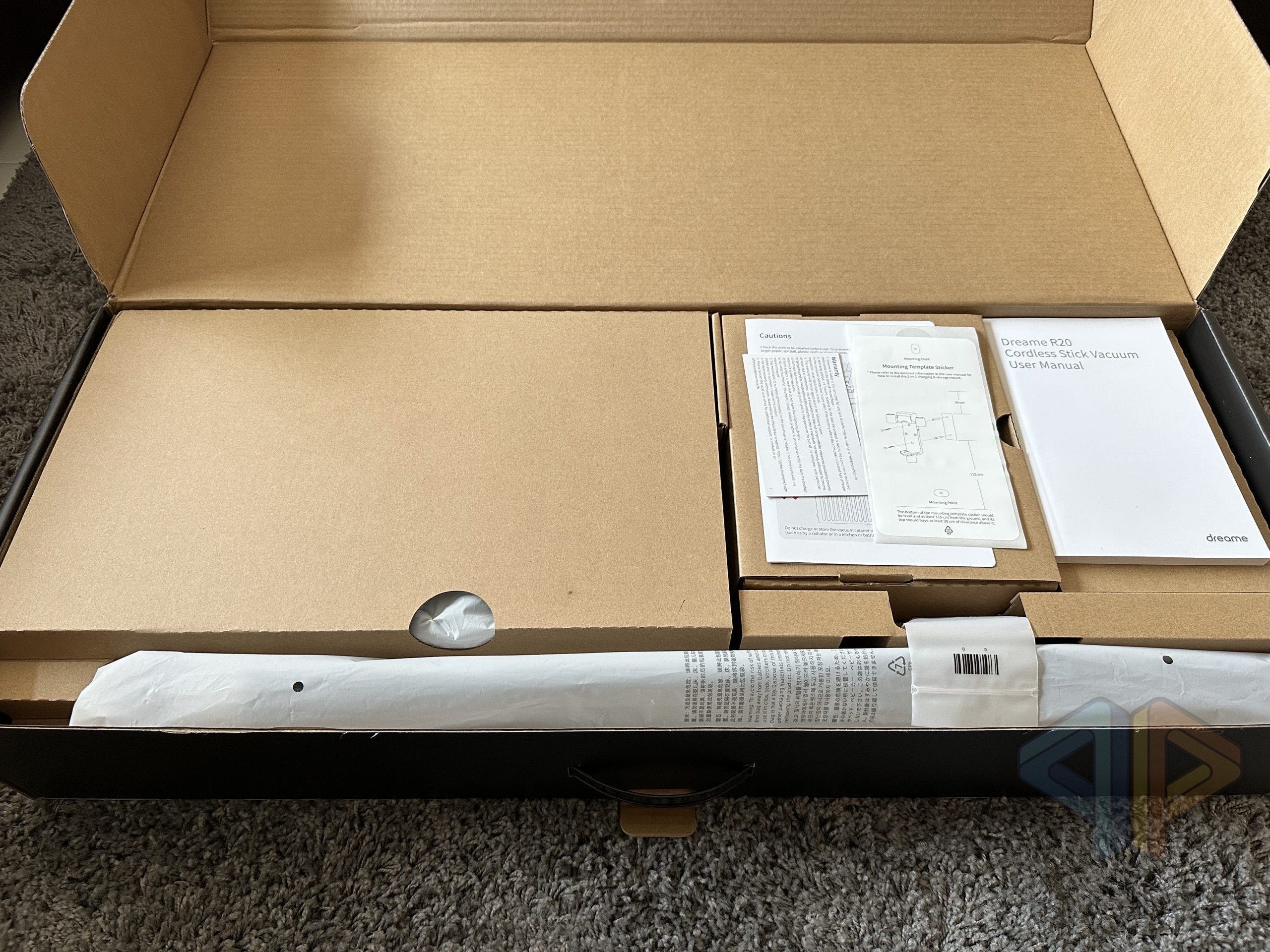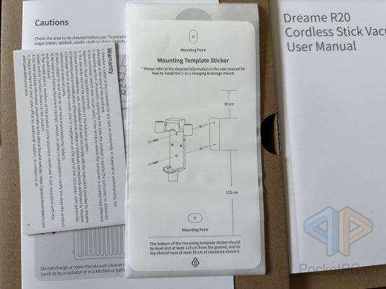 Das üppig illustrierte Verpackungsdesign zeigt bereits vor dem Öffnen, was das Produkt alles zu bieten hat. Innen ist der Karton des Dreame R20 sehr aufgeräumt, alle Zubehörteile sind sicher in Folie verpackt und die meisten haben sogar ihr eigenes Fach. Dreame hat auch direkt eine selbstklebende Bohrschablone für die Wandhalterung beigelegt, sodass umständliches Anzeichnen entfällt. Wären die inneren Kartons noch bedruckt gewesen, hätte man quasi schon von einem Unboxing-Fest sprechen können. Aber der Nachhaltigkeitsaspekt von unbedruckter Pappe ist hier korrekterweise im Vordergrund und trübt in keiner Weise den Ersteindruck. Nur die Kunststoffbeutel um die Einzelteile dürften dann auch weggelassen werden.