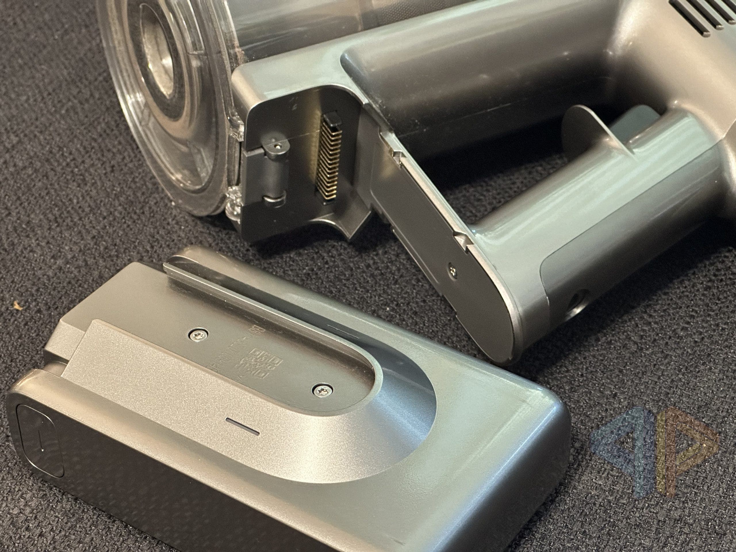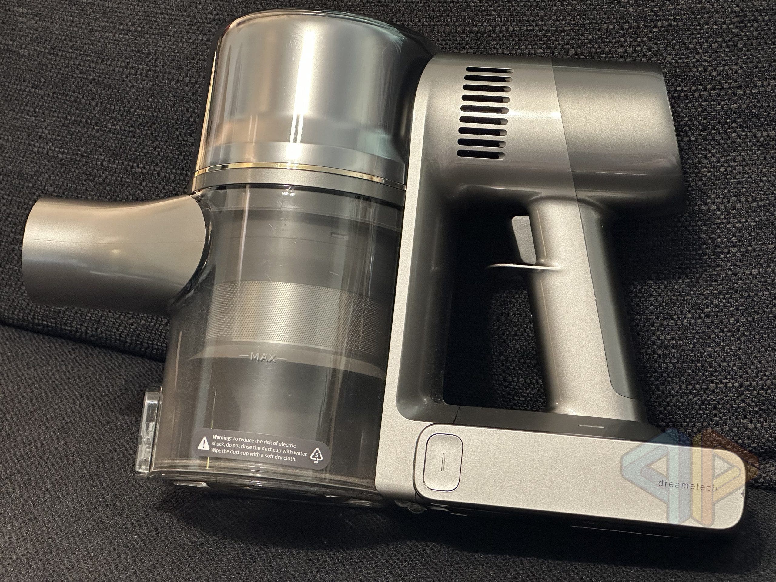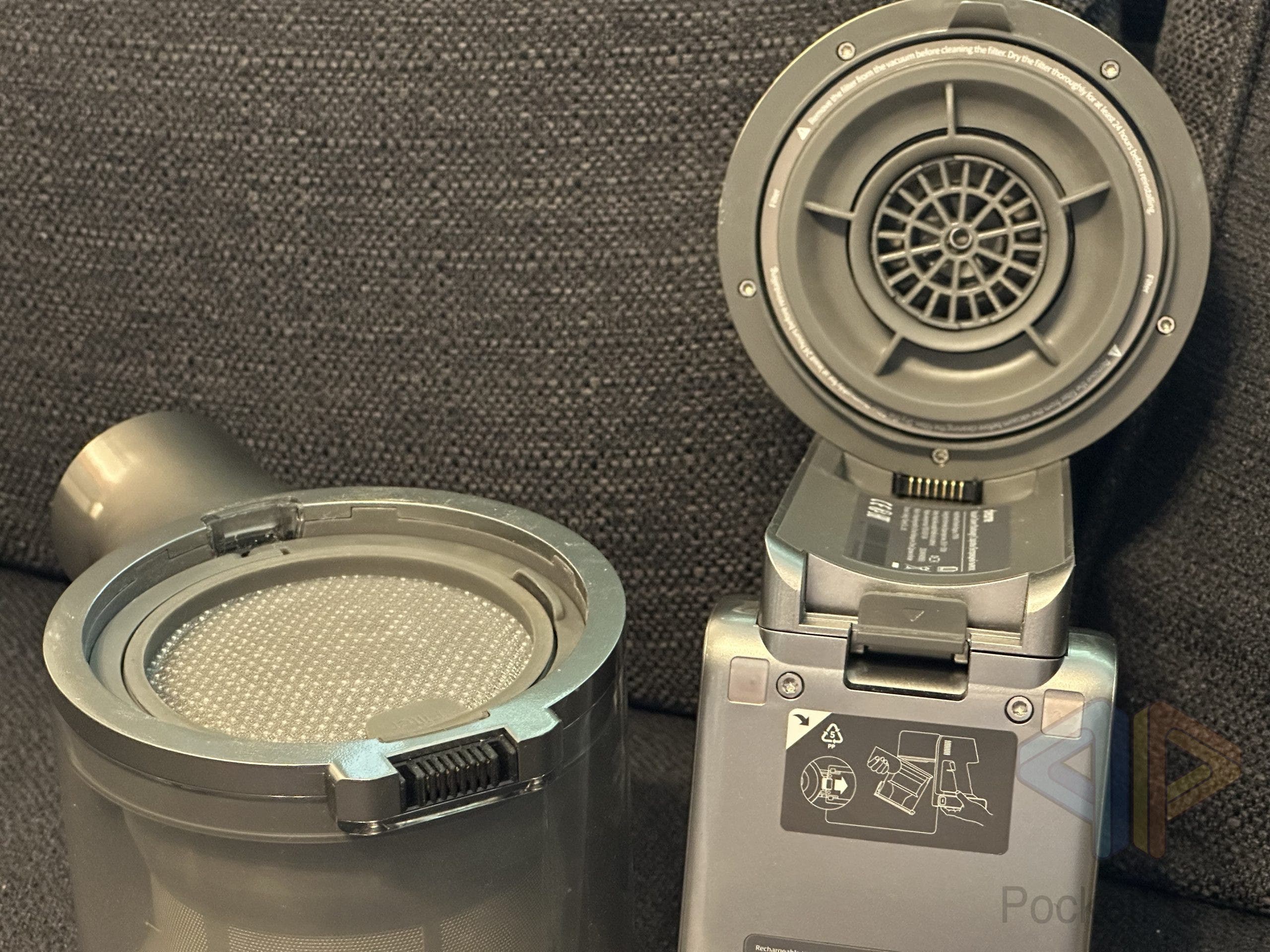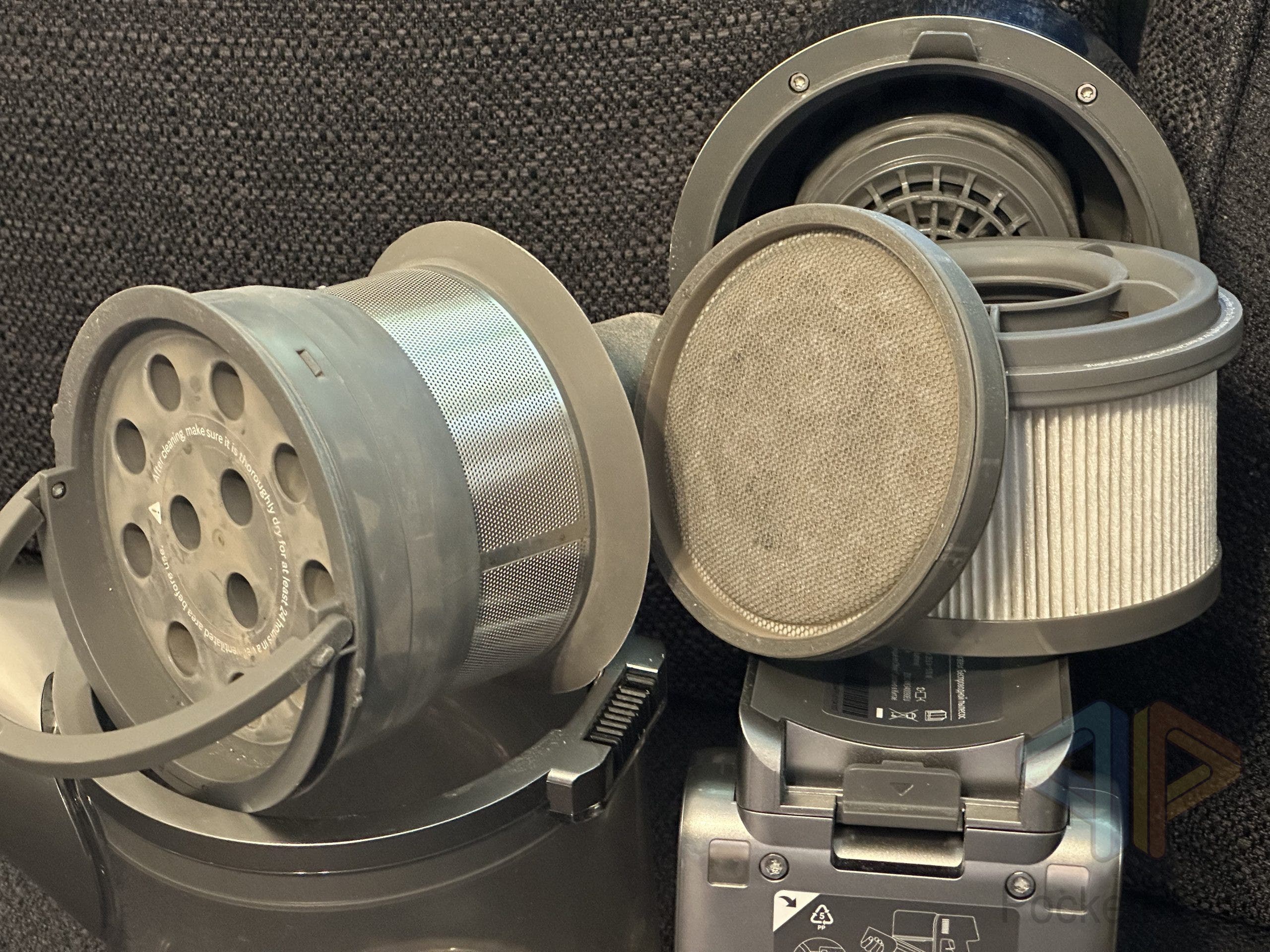 Darum ist es meist empfehlenswert, den Staubbehälter weiter zu zerlegen. Wenn man den Hebel auf der Unterseite zieht und damit den Behälter vom Dreame R20 Staubsauger trennt, kann man die einzelnen Filter entfernen und so einfacher den Schmutz in den Mülleimer kippen, ohne in einer Feinstaubwolke zu stehen. Der eingesaugte Schmutz und Staub wird nämlich von einem mehrstufigen Filtersystem getrennt und komplett von den Filtern aufgefangen, sodass kein Feinstaub beim Saugen in die Luft geblasen wird. Die Filter lassen sich ausserdem einfach auswaschen und in der Sonne trocknen.