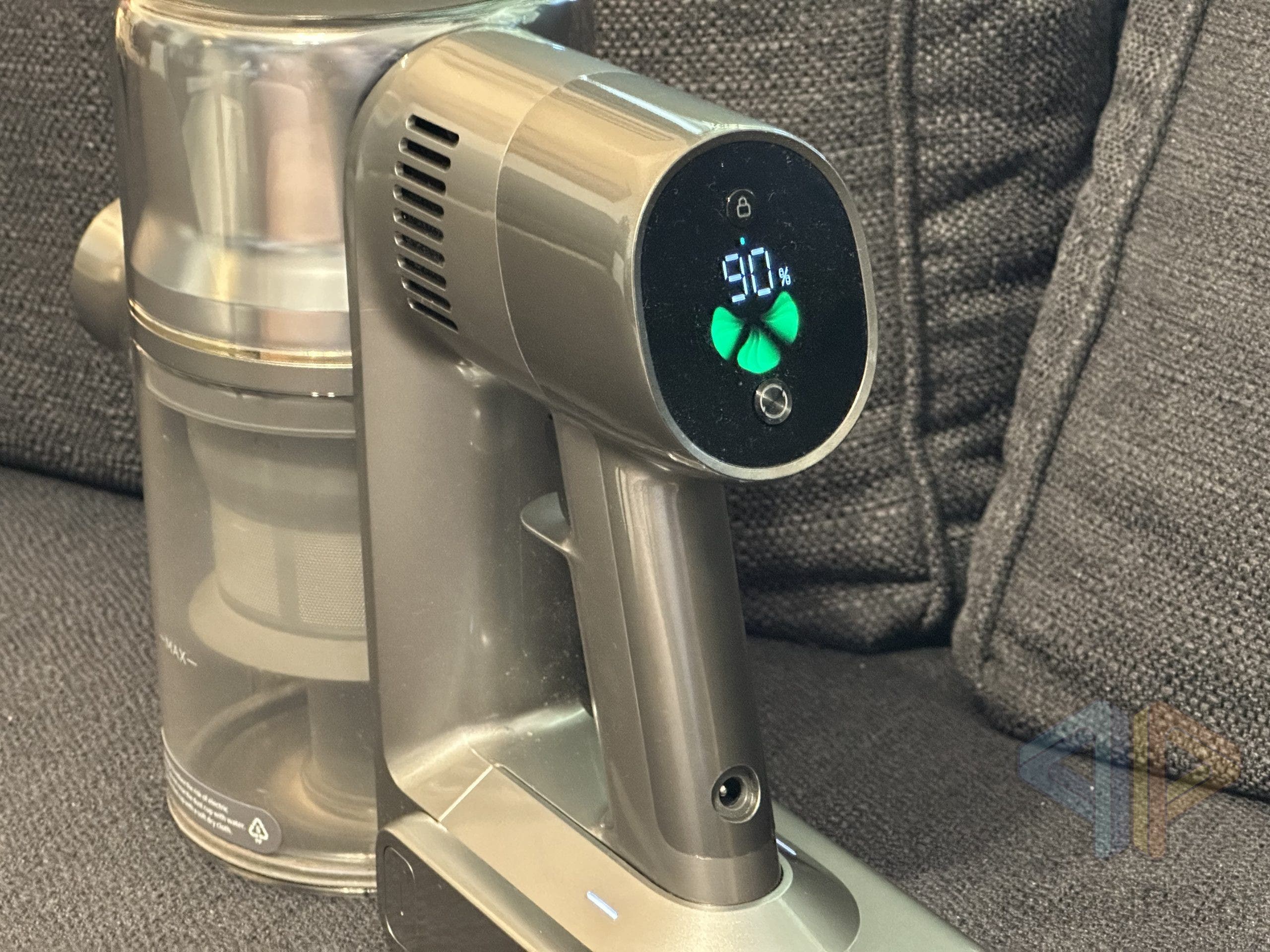 Der Pistolengriff lässt sich gut greifen. Insgesamt liegt der Staubsauger sehr ausbalanciert in der Hand. Das ist vor allem im wichtig, wenn man mit der 2-in-1- oder auch Fugenbürste für längere Zeit arbeitet, wie beispielsweise beim Aussaugen des Fahrzeugs. Um den Dreame R20 einzuschalten, hat man die Wahl, den Einschaltknopf einmal zu drücken oder gedrückt zu halten. Diese Funktion lässt sich mit der kleinen Taste über dem Display umschalten und wird mit einer kleinen, weissen LED signalisiert. Mit der unteren Taste wählt man zwischen dem Automatikmodus oder voller Saugleistung im Betrieb.