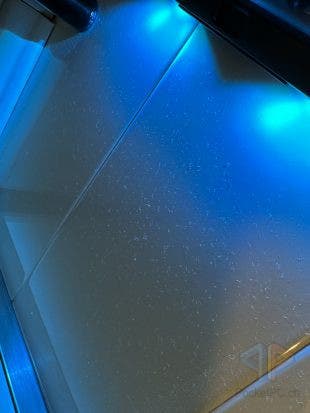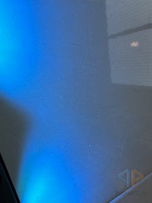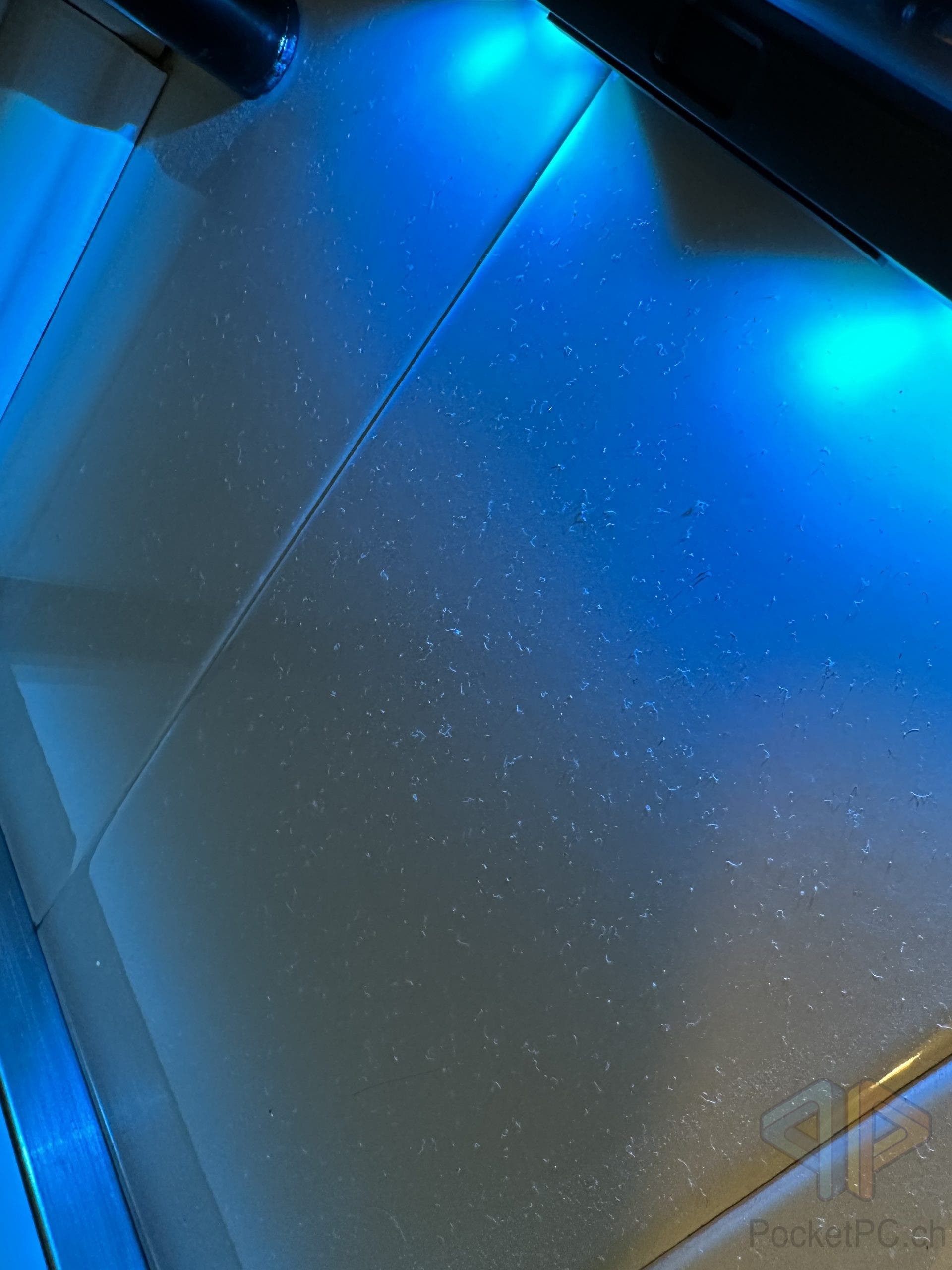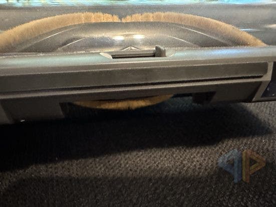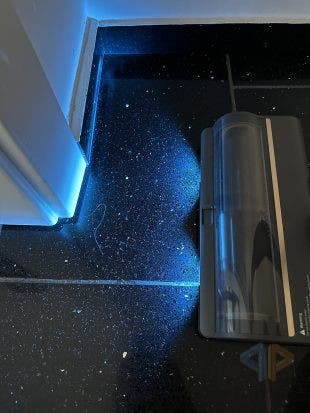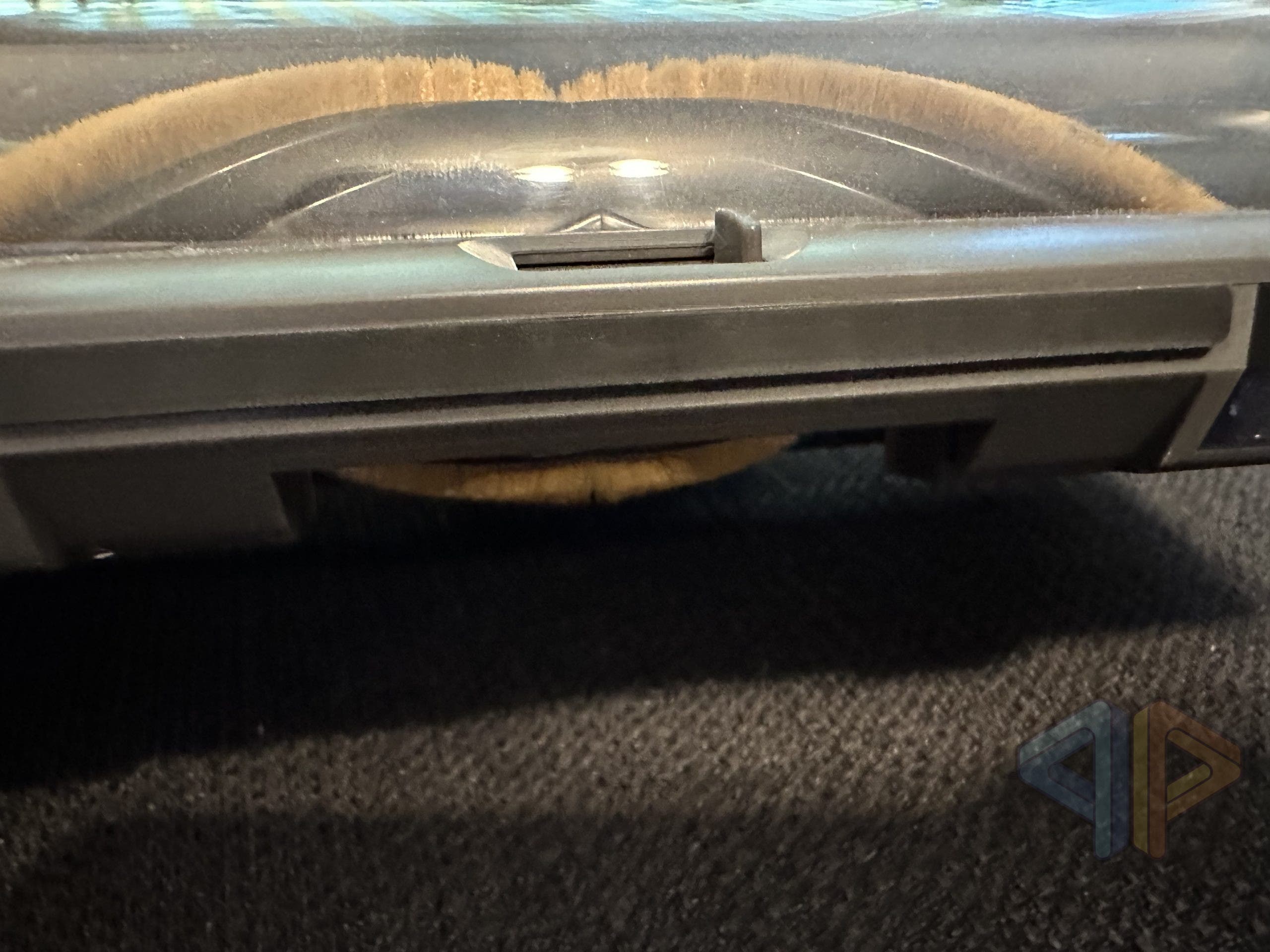 Die wohl grösste und interessanteste Neuerung ist das die blaue LED an der Multibodenbürste. Dieser ist übrigens auch für den Hartboden geeignet, kann aber aufgrund der geschlosseneren Bauweise nicht sehr groben Schmutz aufsaugen. Auch hier hat sich Dreame etwas einfallen lassen und einen Schieber in der Mitte integriert, den man bei Bedarf öffnen kann. Dennoch ist man mit der Hartbodenbürste entsprechend ein wenig schneller und effizient unterwegs. Was genau macht aber jetzt dieses Licht? Es leuchtet Staub mit einem Winkel von 138 Grad an und lässt diesem auf dem Boden erstaunlich effektiv sichtbar werden. Die Sichtweite ist nicht sehr gross, aber man erkennt Staub bis ca. 5 – 8 cm vor der Bürste sehr gut. Selbst bei Tageslicht. Dies sorgt dann für eine Mischung aus Erstaunen und dem Drang, den Boden sauber halten zu wollen.