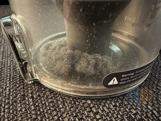 Zum Ausleeren drückt man den Heben unten an der Front ein, worauf sich die Bodenklappe öffnet und der eingesaugte Schmutz herausfällt. Hierfür ist aber nicht wirklich ein Mechanismus im Inneren des 600 ml grossen Staubbehälters verantwortlich. Allein die Wucht des Öffnens sorgt für eine kleine Erschütterung, um den Inhalt des Behälters etwas zu lockern. Die Schwerkraft tut das Übrige. Der Klappmechanismus zeigt sich jedoch keinesfalls negativ für die Langlebigkeit sondern garantiert vielmehr dass die Klappe sich auch öffnet. Leider staubt es beim Ausleeren dann auch auch unter Umständen entsprechend.