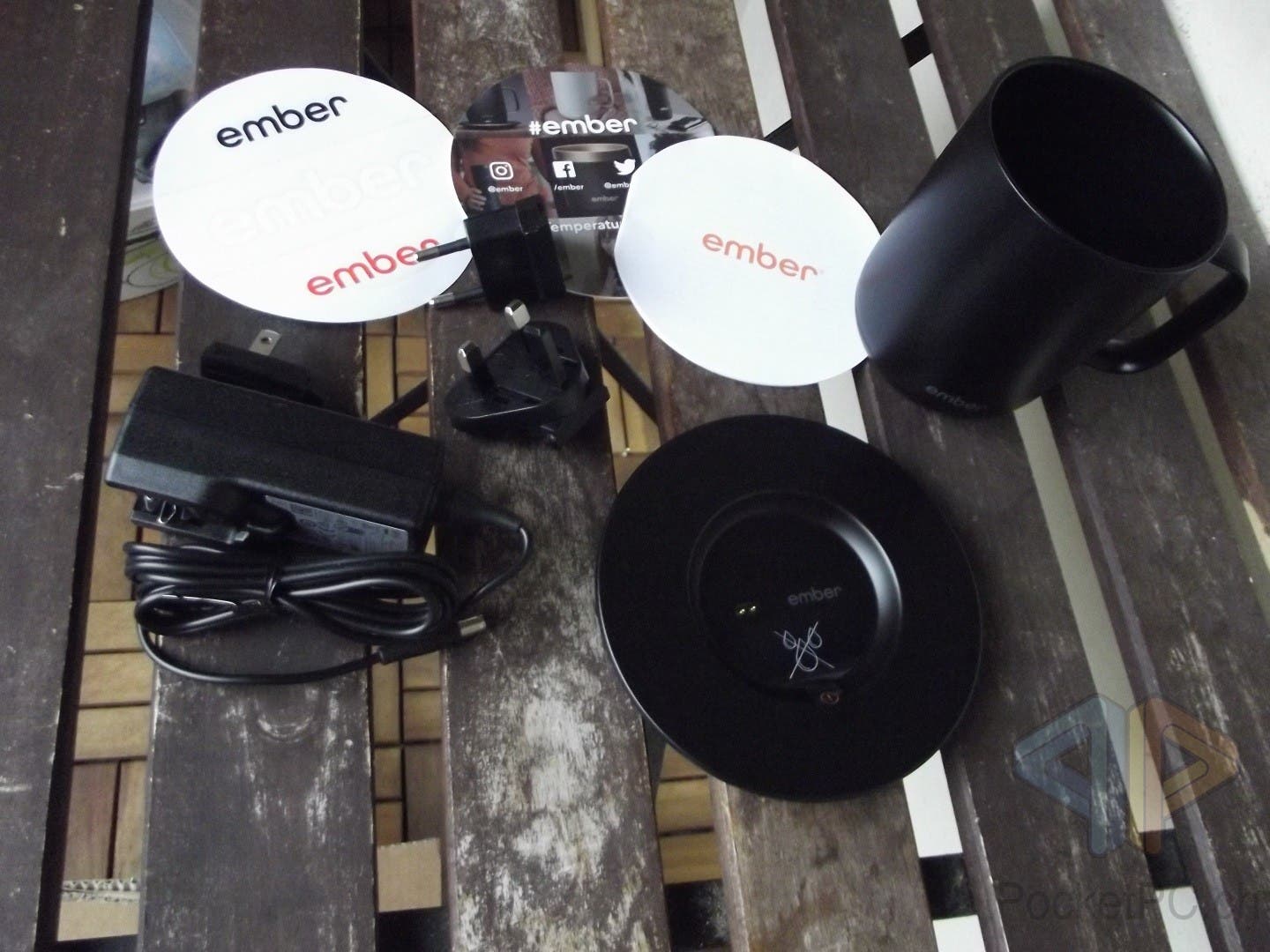 Geliefert wird die Ceramic Mug von Ember, die nach IPX7 Schutzklasse wasserfest (aber nicht spülmaschinengeeignet) ist, mit Kurzanleitung, Social Media leaflet, Sickern mit dem Ember Logo sowie einer Ladestation in Form einer passenden Untertasse mit entsprechendem Netzteil. Letzteres verfügt über mehrere, austauschbare Stecker, so dass die smarte Tasse mit Temperaturregelung weltweit einsetzbar sein dürfte.