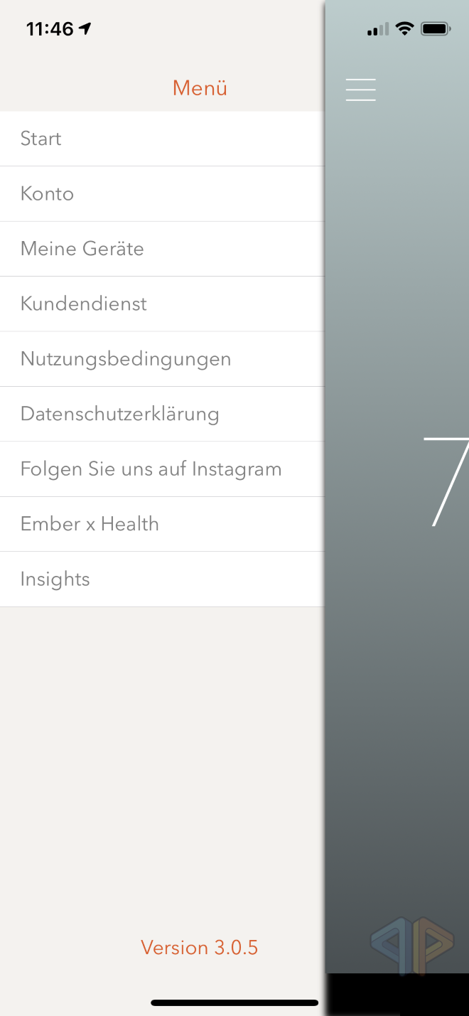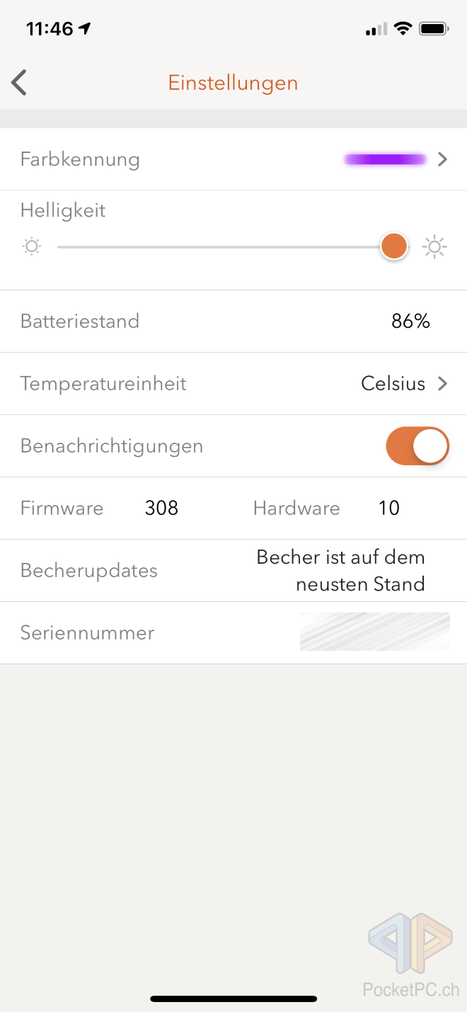 In der Ember App lassen sich nunmehr ein paar Einstellungen vornehmen und Ember Technologies auf Instagram folgen. Aha. Die Einstellungen erlauben die freie Auswahl der Farbe für die breite Benachrichtigungs-LED der Tasse sowie die Einstellung der Helligkeit derselbigen. Auch kann die Temperatureinheit und die Sprache, gewählt werden. Zudem zeigt die App den Batteriestand sowie Firmware- und Hardware-Versionen an. Klingt komisch, ist aber so: Die Kaffeetasse hat nun eine Firmware, die auch ein Update bekommt.